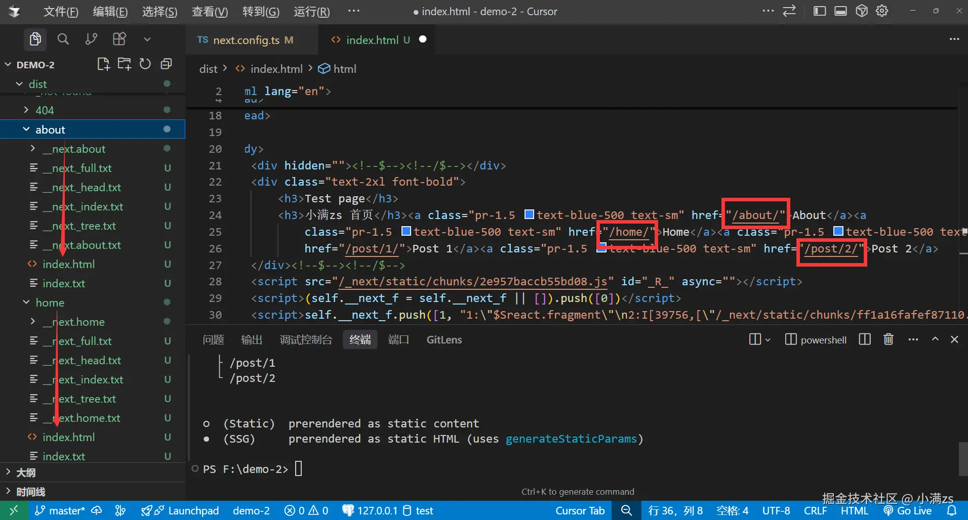 启动完成之后发现点击a标签无法进行跳转,是因为打完包之后的页面叫about.html,而我们的跳转链接是/about,所以需要修改配置项。