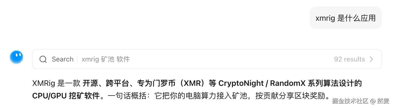 除了 hash进程 CPU 飙高以外,还有2 个进程 xmrig和 javs, 启动进程的用户是 1001,用 AI 查一下对应进程是什么
