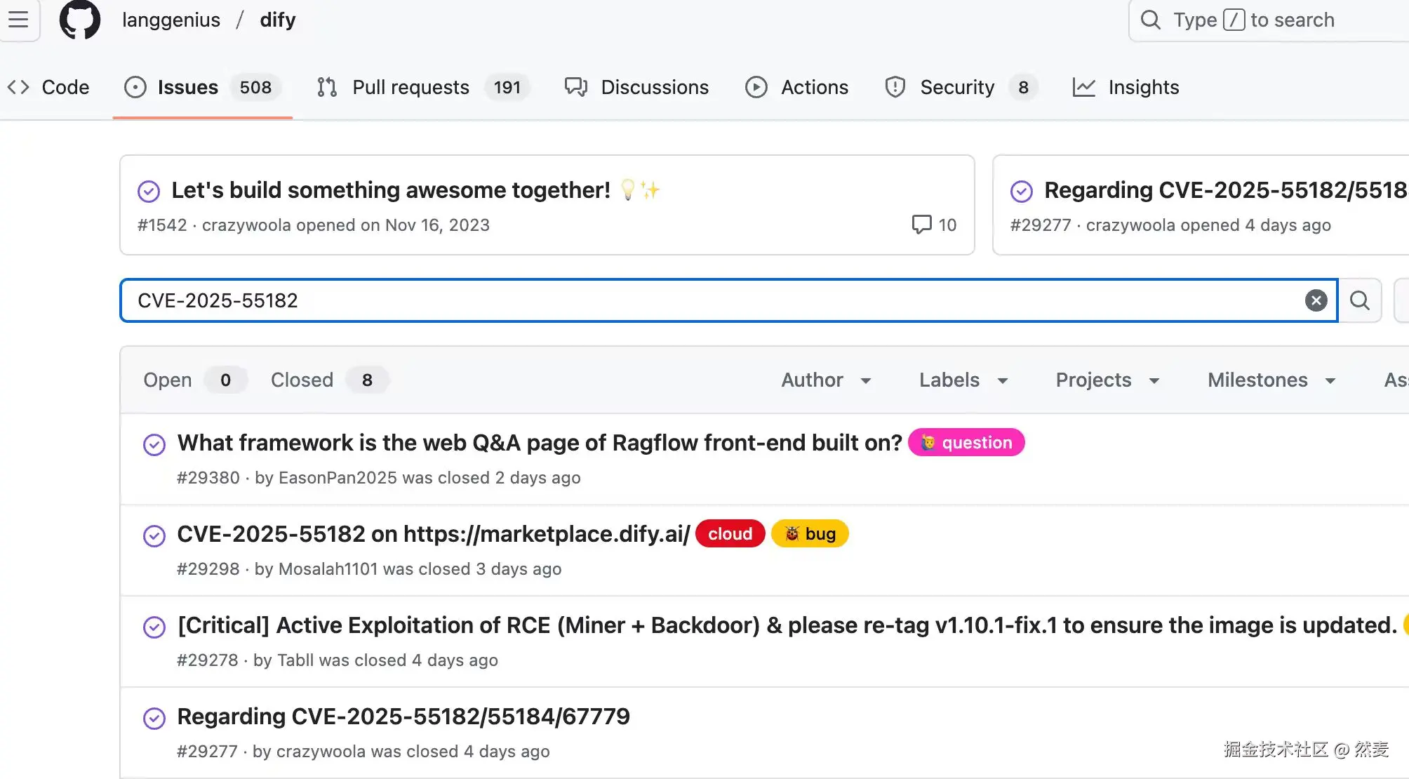 哦,那查一下 dify 的 issues 是否有 CVE-2025-55182漏洞,