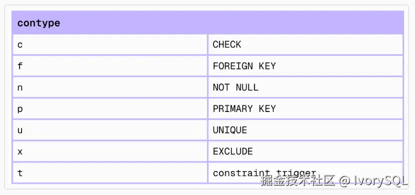在 pg_constraint 中,使用 CREATE CONSTRAINT TRIGGER 创建的约束触发器同样会生成记录,其 contype 标记为 t。常见约束如 UNIQUE 为 u,CHECK 为 c。