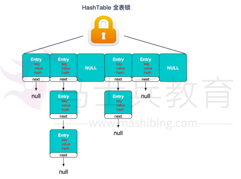 ② Hashtable(同一把锁) :使用 synchronized 来保证线程安全,效率非常低下。当一个线程访问同步方法 时,其他线程也访问同步方法,可能会进入阻塞或轮询状态,如使用 put 添加元素,另一个线程不能使 用 put 添加元素,也不能使用 get,竞争会越来越激烈效率越低。