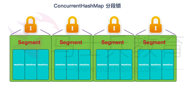 ConcurrentHashMap对整个桶数组进行了分割分段(Segment),然后在每一个分段上都用lock锁进 行保护,相对于HashTable的synchronized 锁的粒度更精细了一些,并发性能更好,而HashMap 没有锁机制,不是线程安全的。(JDK1.8之后ConcurrentHashMap启了一种全新的方式实现,利用 CAS算法。)