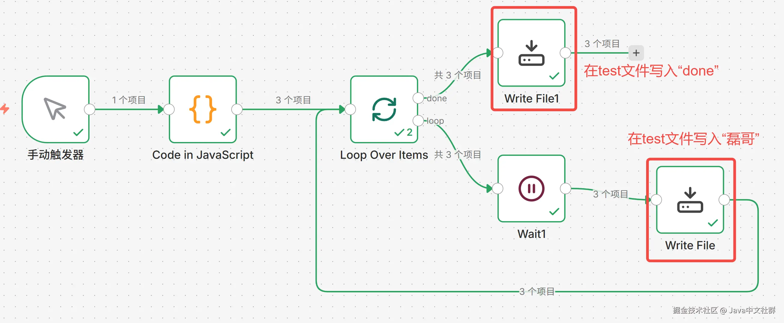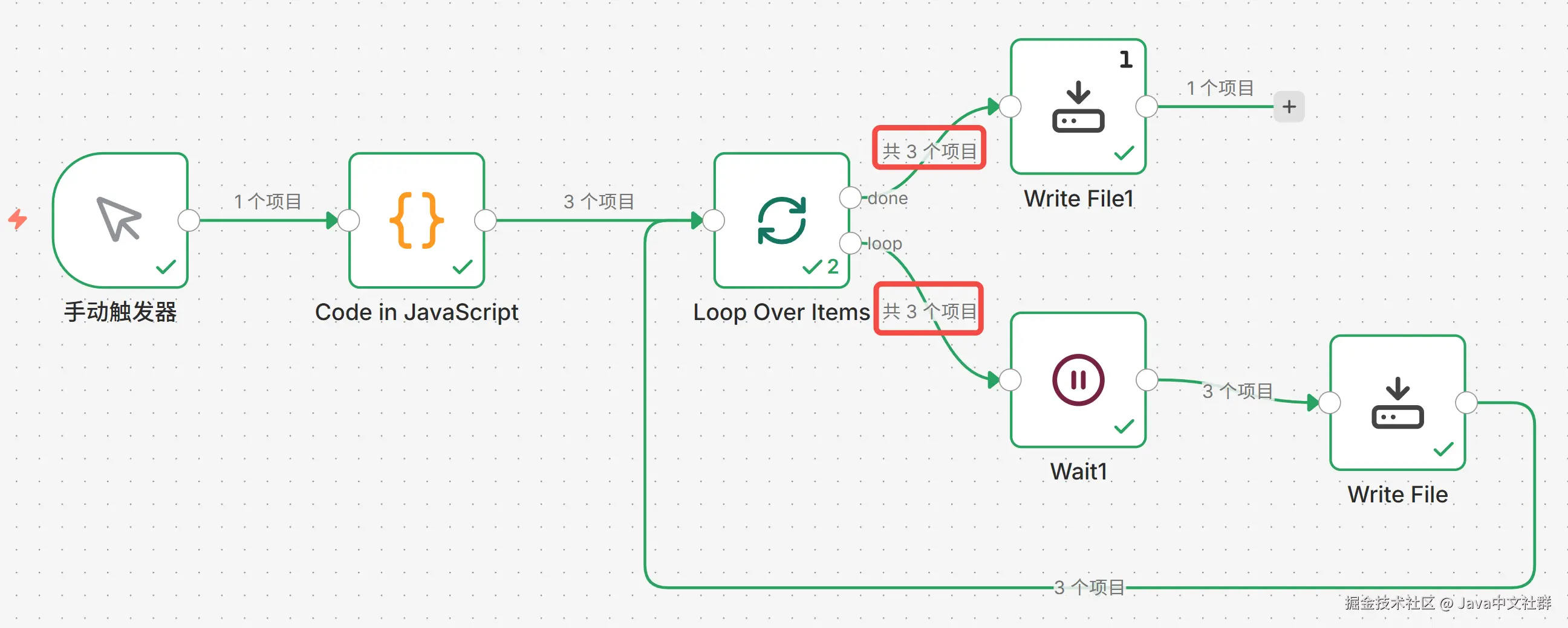 明明官方文档说 loop 分支是循环执行,而 done 分支是在循环结束后只执行一次。结果你自己一上手:好家伙,loop 跑了 3 次,done 后面接的节点居然也跟着跑了 3 次!🤯 如下图所示: