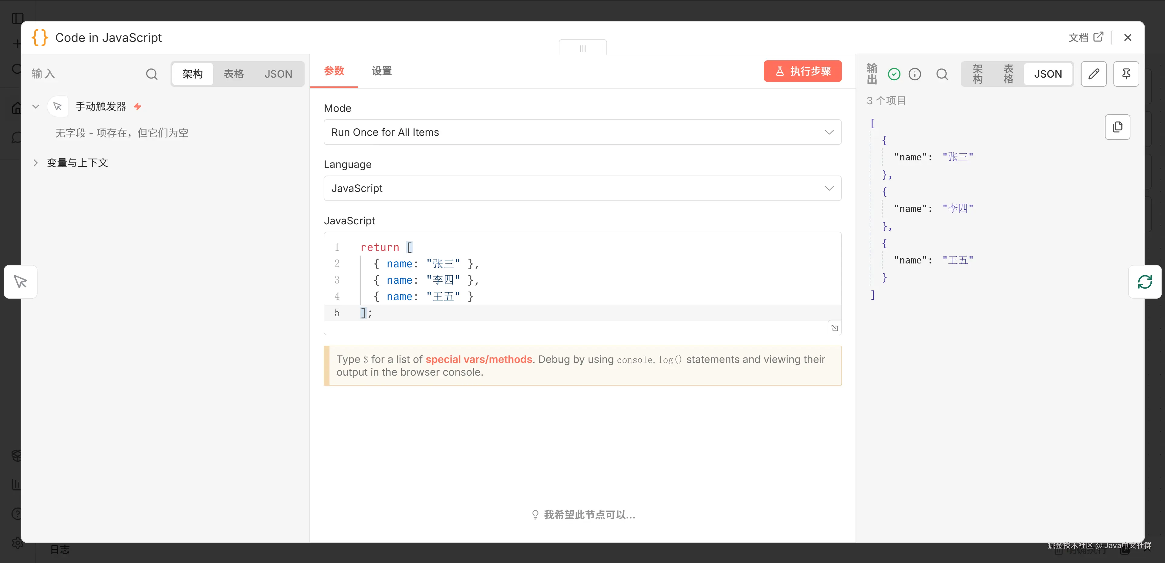 在工作流里,我用代码节点(Code Node)输出了三项内容:张三、李四、王五。