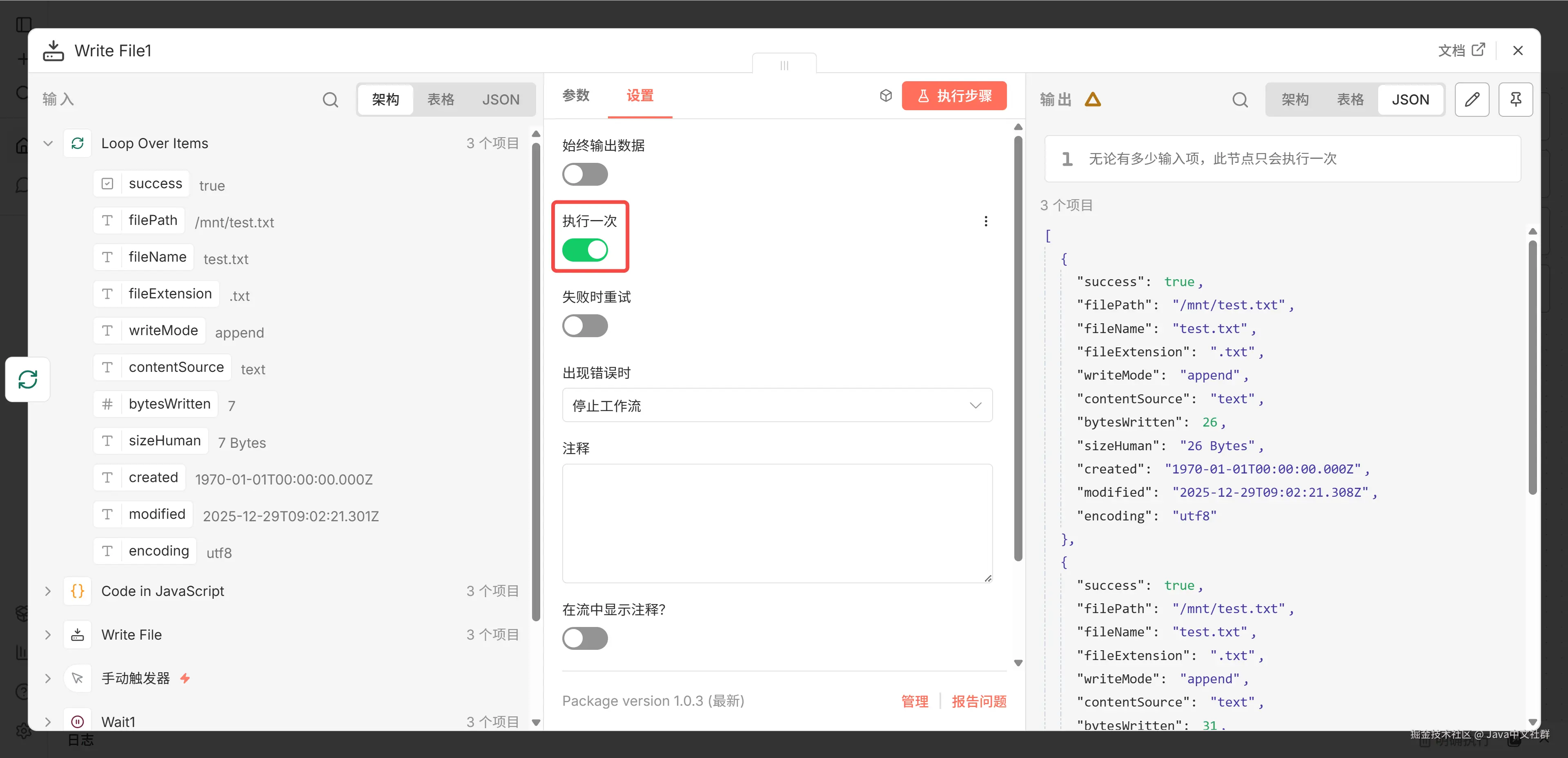 开启这个开关后,无论前面传过来 3 条还是 3000 条数据,这个节点都只会执行一次。这才是符合我们预期的"循环结束"动作,最终执行效果如下: