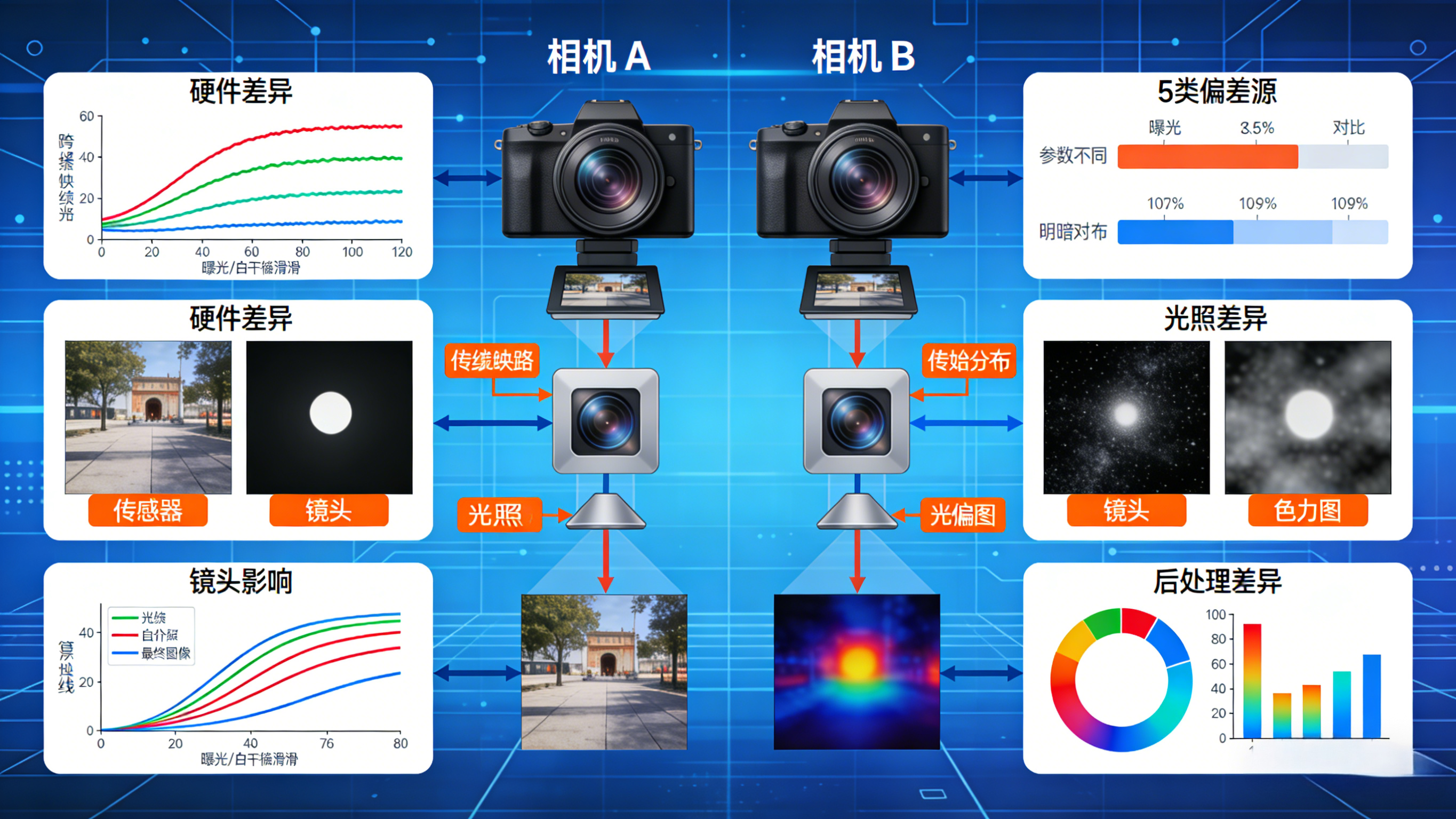 硬件固有差异:相机传感器的感光灵敏度、滤光片波长响应不同(如索尼IMX307与IMX477传感器的色彩表现差异);
