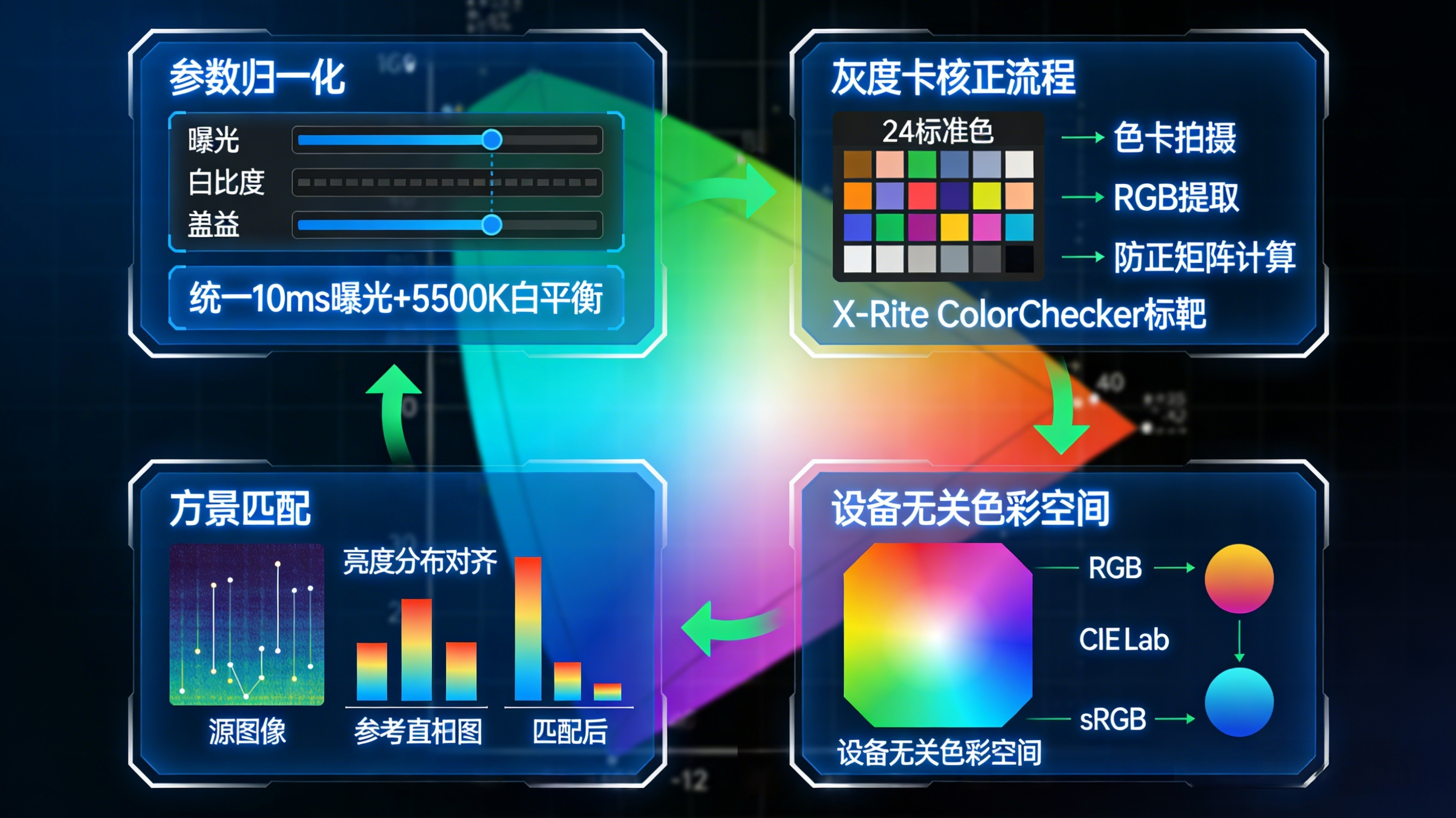 核心逻辑:用标准24色卡或灰度卡作为参考,让各设备拍摄同一色卡,计算色彩校正矩阵,将各设备的图像映射到标准色彩空间;