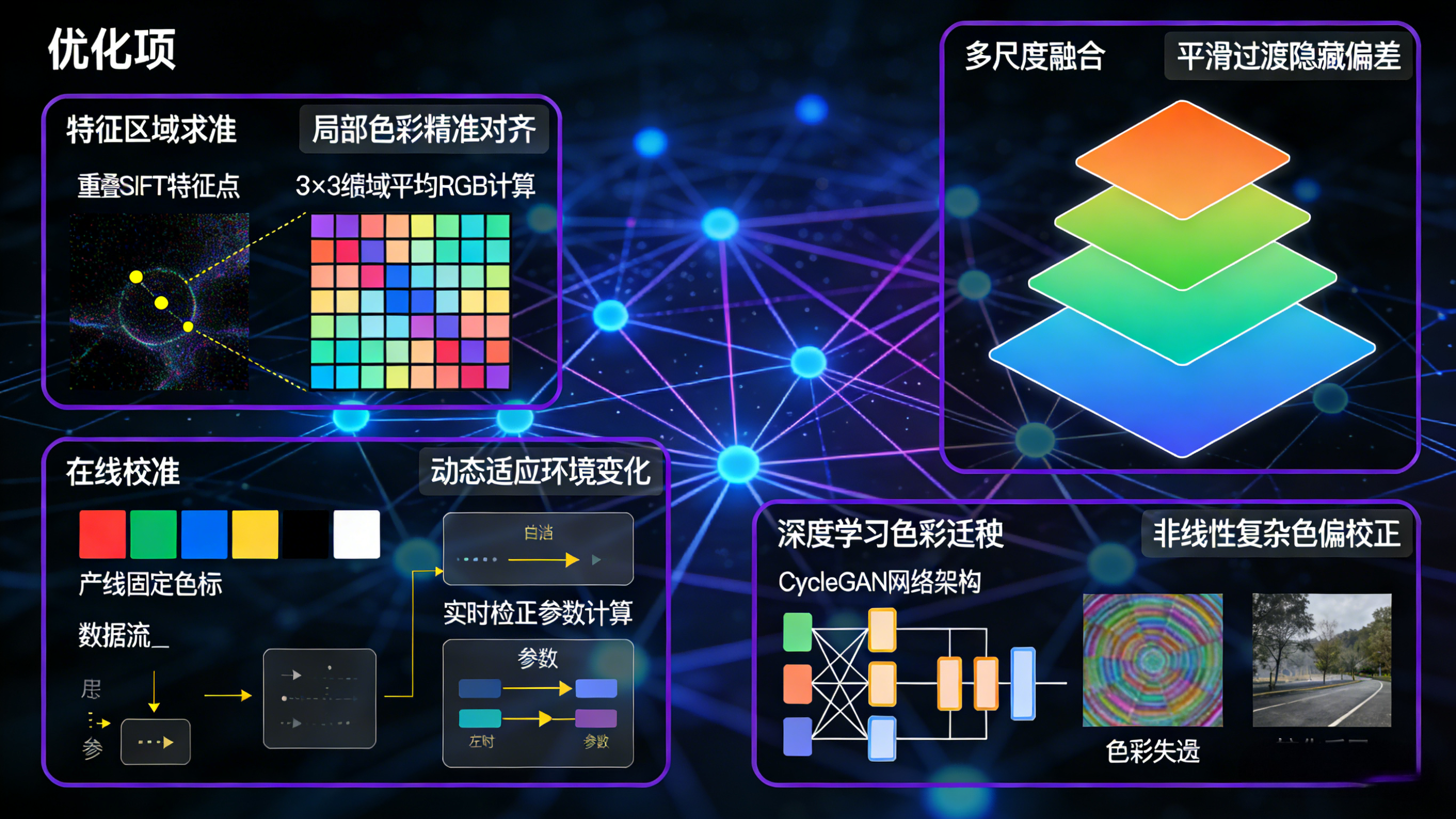 对于大视野、光照不均的场景,将图像分块,对每个区块单独进行色彩校正,再拼接,能提升整体色彩一致性;