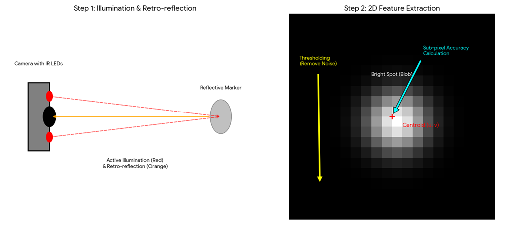 光学追踪分为两个关键步骤。第一步:主动照明与回射反射------相机周围配备红外LED灯环,发出红外光照射追踪区域。当红外光照射到反光标记点(通常是由回射反射材料制成的小球)时,光线会沿原路径强烈反射回相机,形成明亮的光斑。第二步:2D特征提取------相机传感器捕获到的图像经过阈值处理(Thresholding)去除噪声后,亮点区域(Bright Spot Blob)会被识别出来。系统进一步计算每个亮斑的质心(Centroid)坐标(u, v),并通过亚像素算法(Sub-pixel Accuracy Calculation)将定位精度提升到像素级别以下,这是实现毫米级甚至亚毫米级追踪精度的关键技术。