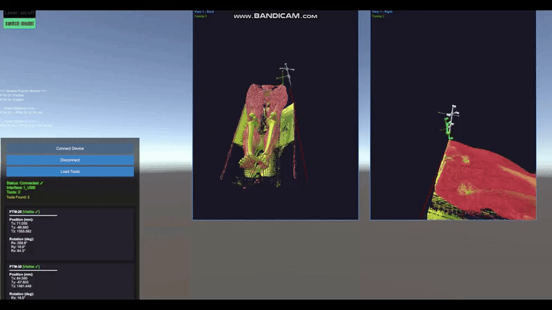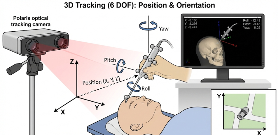 展示了NDI Polaris光学追踪相机在实际医疗场景中的应用。系统通过红外相机实时追踪手术器械上的标记点,精确计算出器械在三维空间中的位置(X, Y, Z坐标)和三个旋转角度(Yaw偏航、Pitch俯仰、Roll滚转),达到6自由度追踪。这使得医生在进行神经外科、脊柱手术等精密操作时,能在屏幕上看到器械相对于患者解剖结构(如CT扫描的骨骼模型)的实时位置,大幅提高手术精度和安全性。这种亚毫米级的追踪精度正是光学定位系统从1990年代起在医疗领域广泛应用的核心价值。