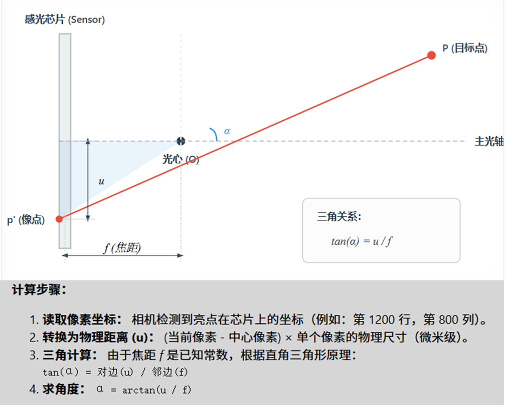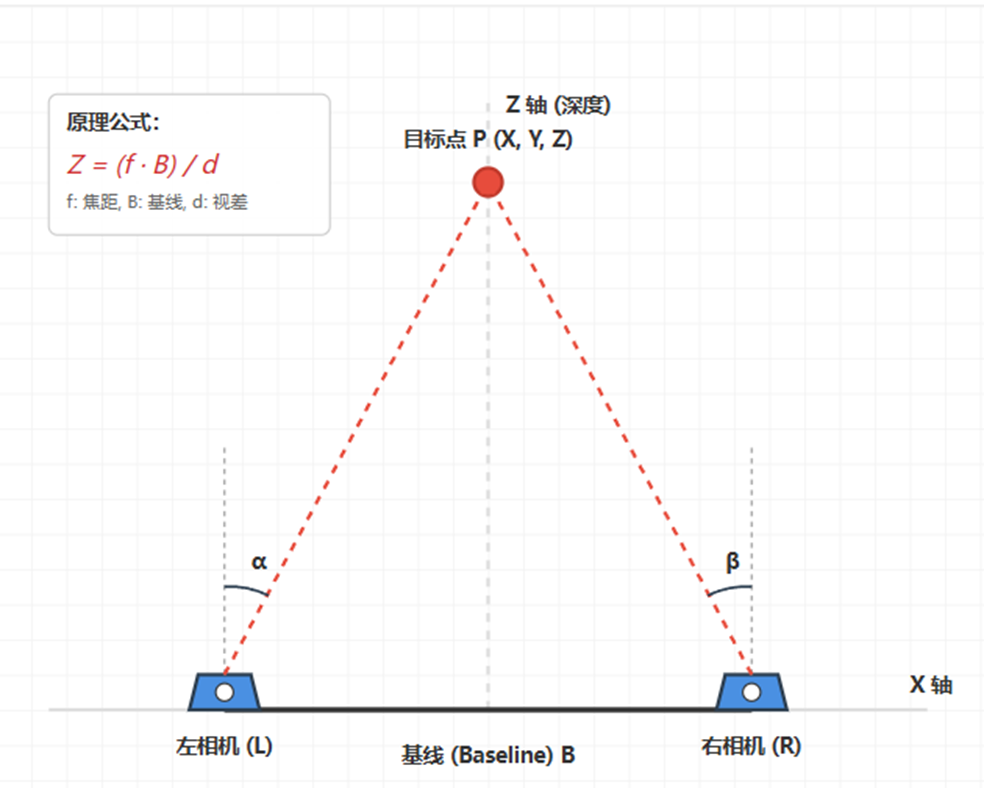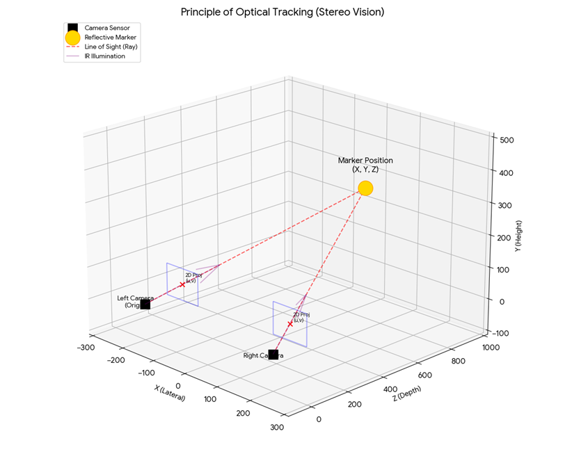 光学追踪系统的核心原理是立体视觉技术。系统使用至少两个精确校准的相机(左相机和右相机)从不同角度同时观察反光标记点。每个相机捕捉到标记点在其成像平面上的2D投影位置(用红色虚线表示视线射线),然后通过三角测量法计算出标记点在三维空间中的精确位置坐标(X, Y, Z)。这种双目视觉原理类似于人眼的深度感知机制------正是因为两只眼睛的视角差异,我们才能判断物体的远近。系统中两个相机的基线距离(Baseline)越大,测量的深度精度理论上越高,但同时也会限制可追踪的空间范围。