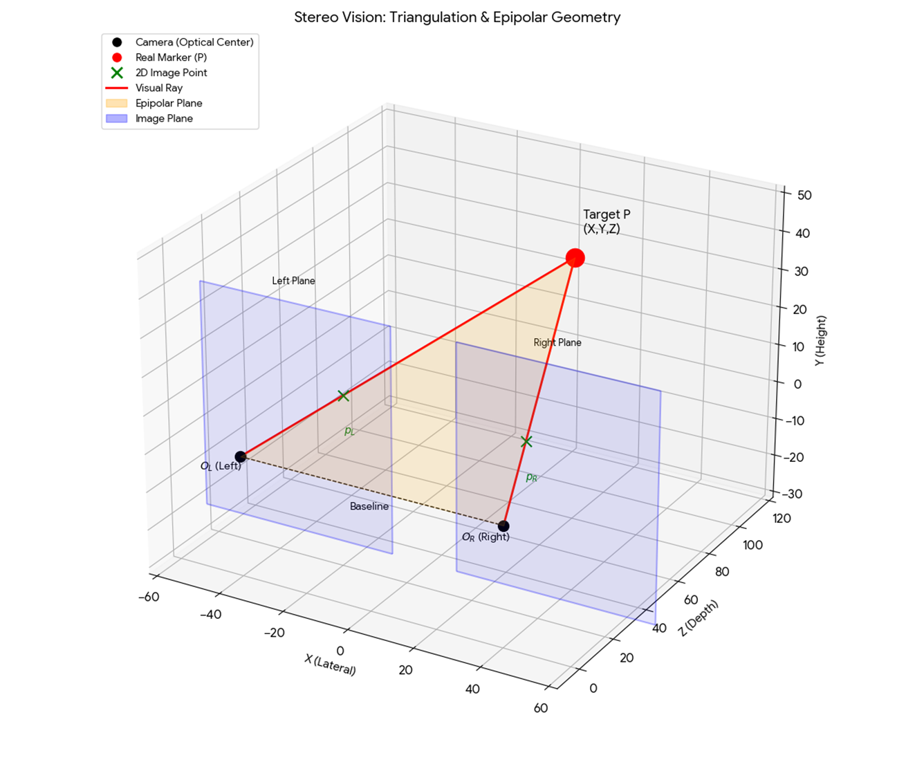这张图展示了立体视觉系统的数学基础------极线几何(Epipolar Geometry)。当左相机和右相机都观察到同一个真实标记点P时,P点在左相机成像平面上的投影位置必然位于对应的极线(Base Line)上,右相机同理。两条从相机光心发出的视线射线(Visual Ray,红色线)在三维空间中相交,交点即为标记点P的真实位置(X,Y,Z)。图中的Baseline表示两个相机光心之间的距离,这是三角测量的基准线。极平面(Epipolar Plane,浅色区域)包含了两个相机光心和目标点P,限定了对应点的搜索范围。这种几何约束不仅提高了计算效率,还能通过多相机冗余观测提升系统的鲁棒性和精度。