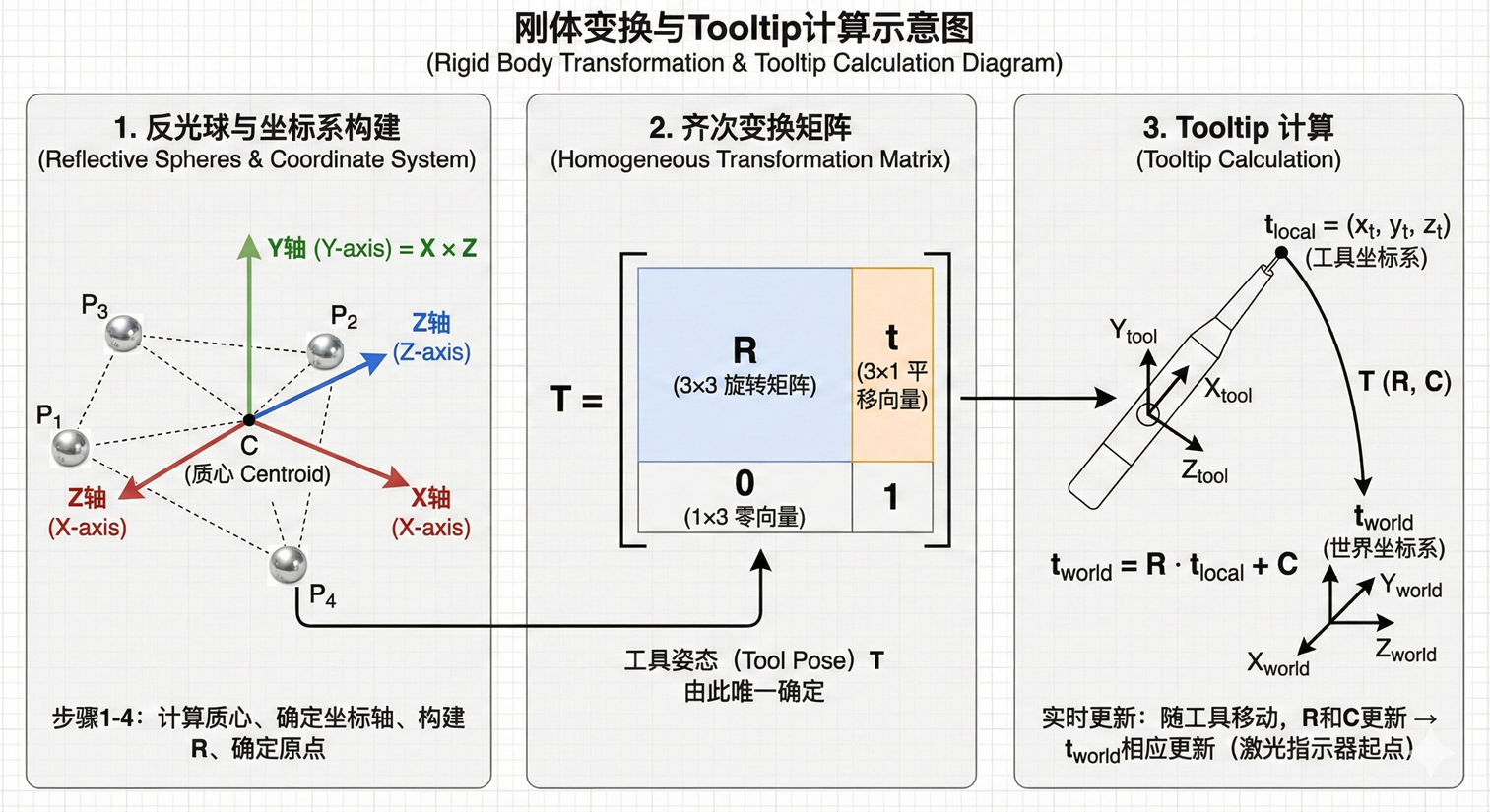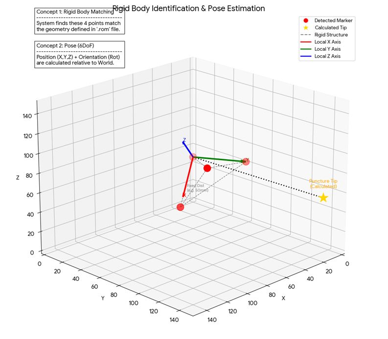 单个标记点只能提供3D位置信息,而要实现6自由度(6DOF)追踪------即同时获取物体的位置(X,Y,Z)和姿态角度(Roll滚转, Pitch俯仰, Yaw偏航),需要在被追踪物体上固定多个标记点形成"刚体"(Rigid Body)。系统首先通过刚体匹配(Concept 1: Rigid Body Matching)识别出当前检测到的标记点簇是否符合预先定义的几何配置(.rom文件中存储了标记点的相对位置关系)。一旦匹配成功,系统利用多个标记点的空间分布信息,通过姿态估计算法(Concept 2: Pose/6DoF Estimation)计算出刚体的本地坐标系(Local X/Y/Z Axis)相对于世界坐标系的位置和旋转矩阵。图中红点是实际检测到的标记点,黄色星星是根据刚体模型计算出的虚拟参考点(如手术工具的尖端),这使得系统能够追踪到物理标记点之外的关键位置,极大扩展了应用场景。