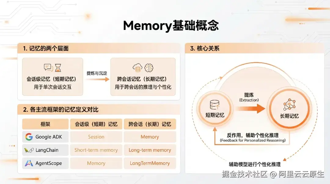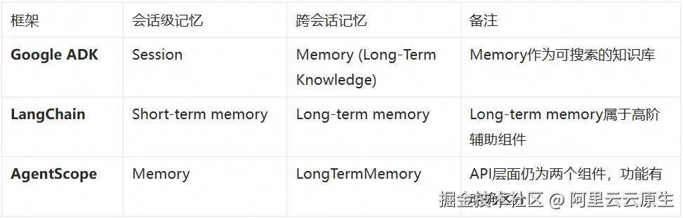- Google ADK: Session 表示单次持续交互;Memory 是长期知识库,可包含来自多次对话的信息