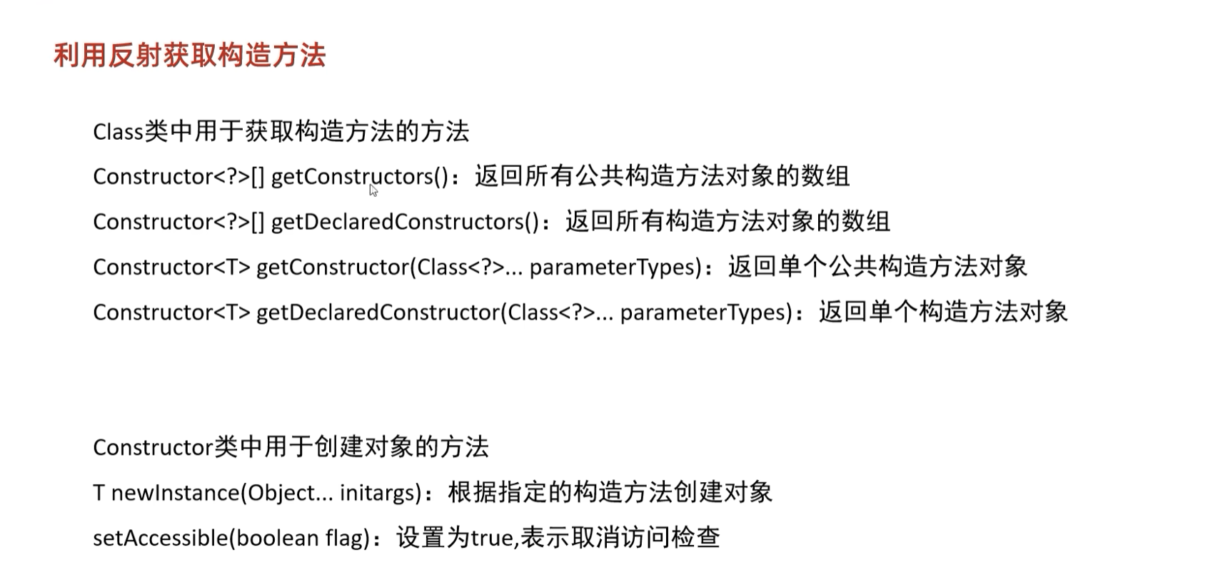 Constructor<?> getDeclaredConstructor(Class<?>... parameterTypes) 返回所有构造方法对象的数组