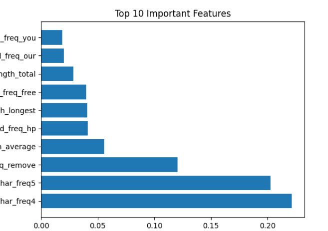 首先,通过调用已训练好的随机森林分类器 rf 的 feature_importances_ 属性,获取所有特征对于预测结果的重要性得分,随后,将这些重要性数值与对应的特征名称组合成一个结构清晰的 DataFrame,最后,利用 sort_values 方法按重要性得分进行降序排序,并选取排名前10的最重要特征,直观地展现出哪些特征在模型的决策过程中起到了关键作用。