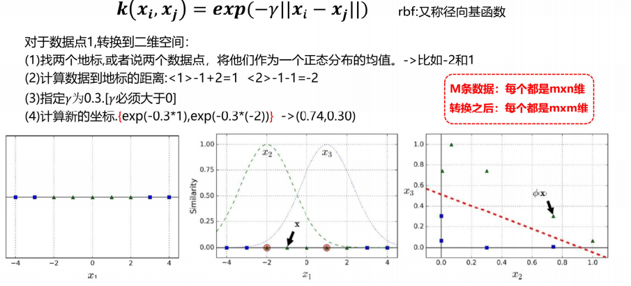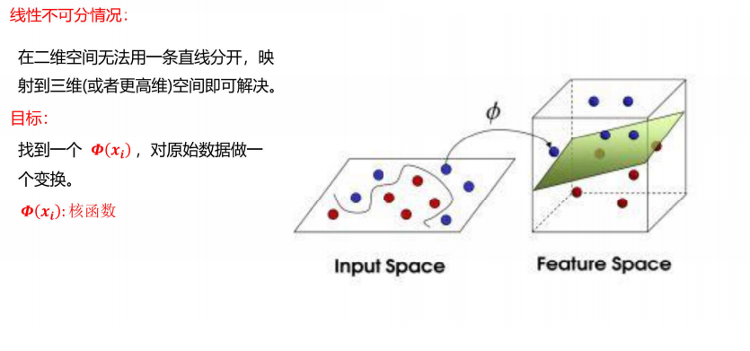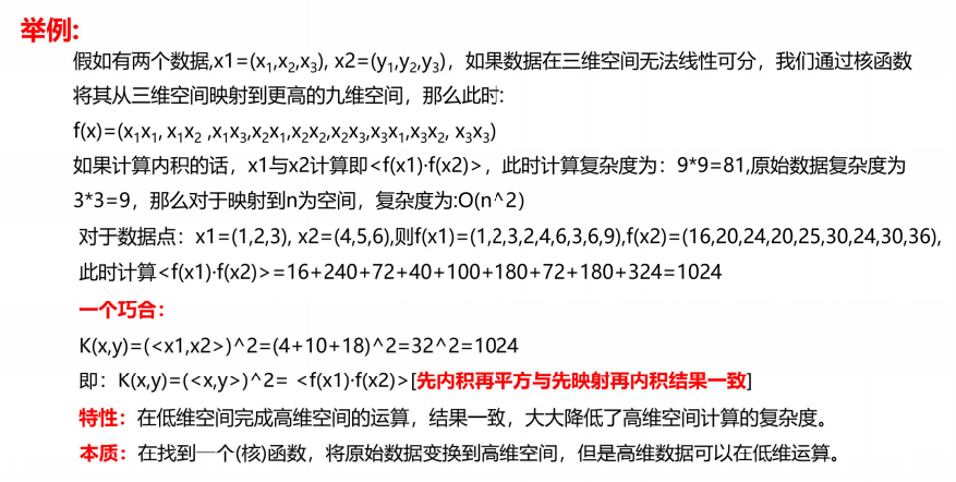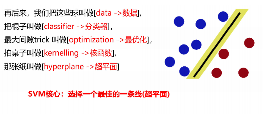解释: "核函数"是支持向量机(SVM)等算法中的一个关键概念。它的主要作用是将原始输入数据(可能在线性不可分的情况下)映射到一个更高维度的特征空间,使得数据在这个新空间中变得线性可分。图片中的"拍桌子"比喻了这种升维的动作,使得原本在一维棍子(低维空间)上难以分开的球,在二维桌面(高维空间)上变得容易用一张纸(新的分类边界)来分隔。
