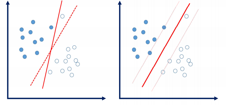 右侧的图中,决策边界离两类数据点都比较远,分类间隔较大。同样,决策边界两侧距离它最近的点是支持向量,大间隔时支持向量离决策边界较远,这使得分类模型具有更好的泛化能力,能够更稳健地对新的数据进行分类,就如同能够迅速通过雷区(避免受到雷区中不确定因素的影响)。