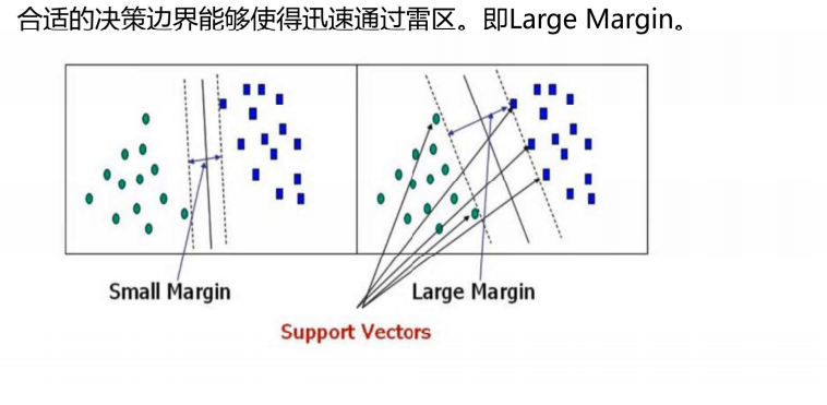 在左侧的图中,决策边界(中间的实线)离两类数据点(绿色圆点和蓝色方块)都比较近,这种情况下分类间隔较小。决策边界两侧距离它最近的点就是支持向量(Support Vectors),可以看到小间隔时支持向量离决策边界较近,分类模型的泛化能力相对较弱,因为它对噪声等干扰比较敏感。