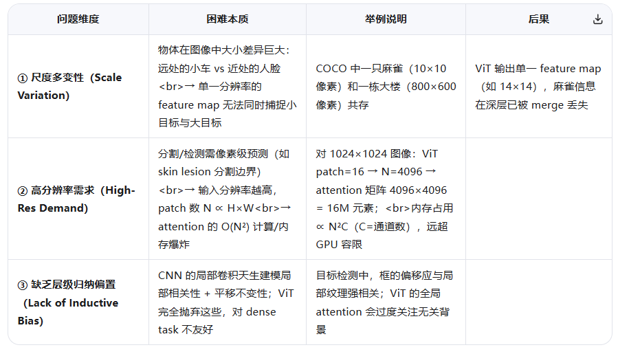 ❗核心矛盾:既要保留 Transformer 的长程建模能力,又要像 CNN 一样高效、分层、适配 dense 任务------但"全局 attention + 层级结构"在计算上互斥。