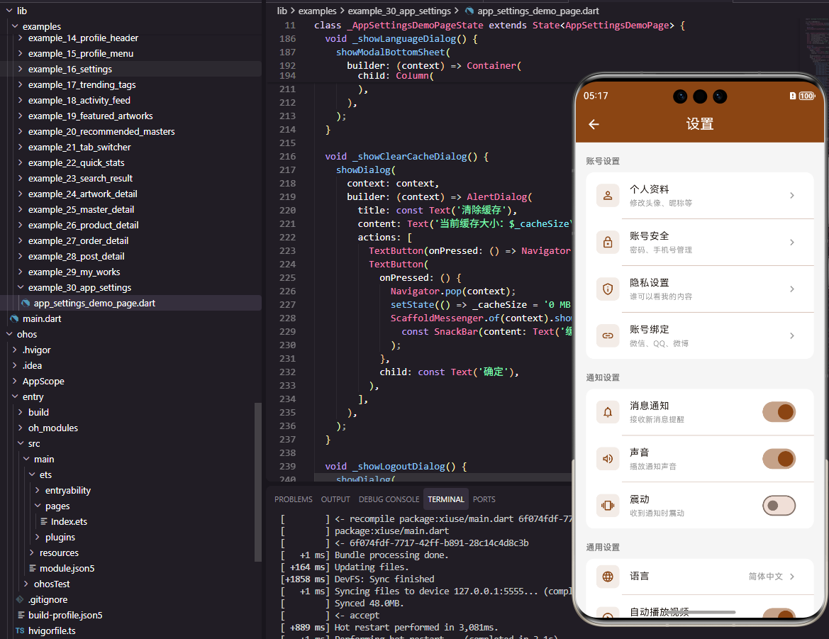 应用设置页面是用户自定义应用行为和偏好的重要入口。它通常包含账号管理、通知设置、隐私设置、缓存清理、关于应用等功能模块。本文将详细介绍如何在Flutter和OpenHarmony平台上实现一个功能完善的应用设置页面,这是本系列的最后一篇文章。