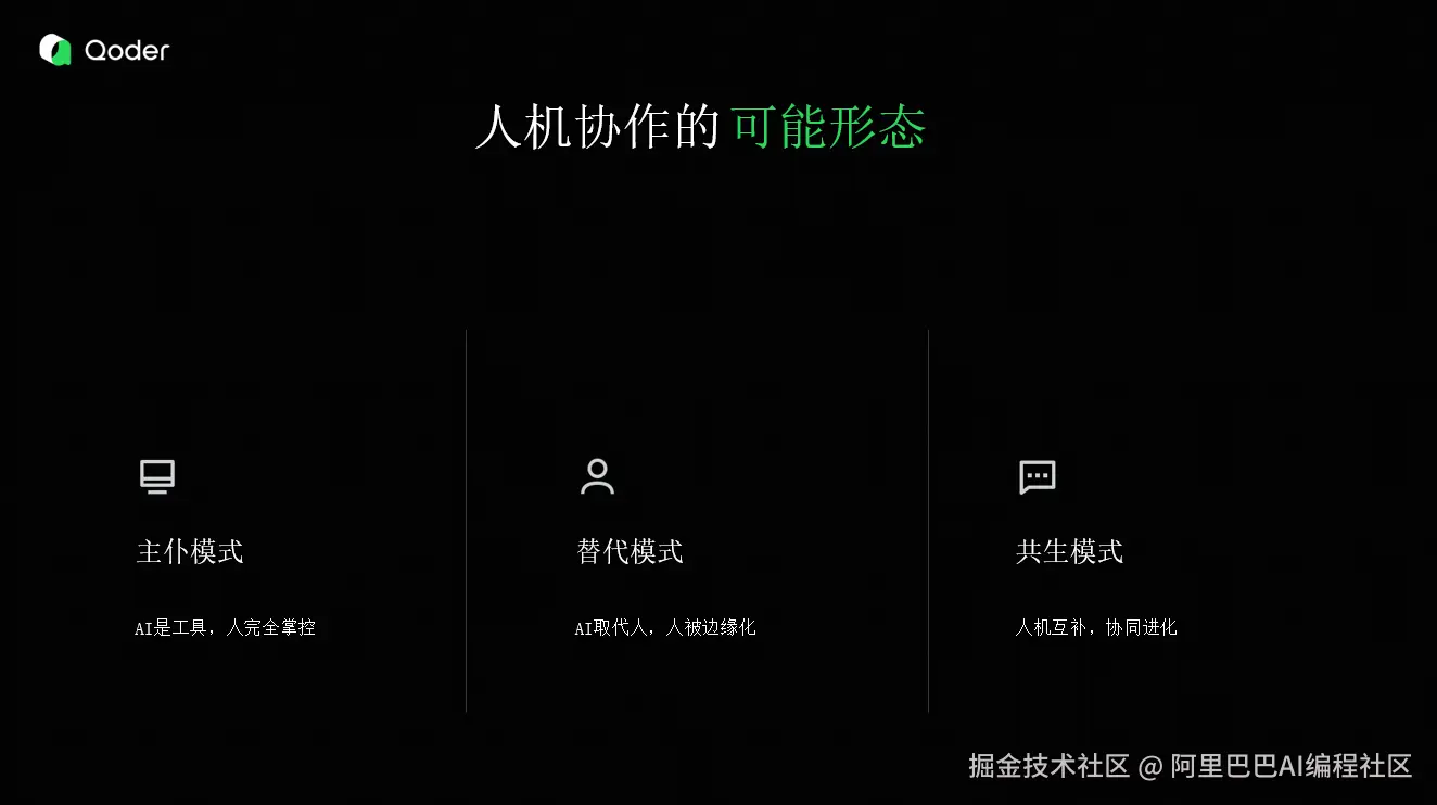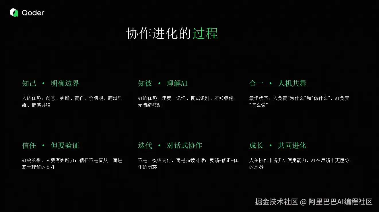 - 角色进化:从 Coder 变为 Creator,从执行者变为决策者,从独行侠变为"人机团队"的指挥官;