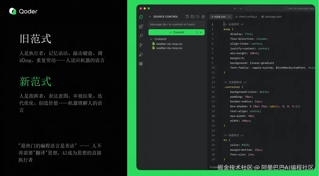 Qoder 目前支持上下文工程,你可以将上下文丢给 Qoder,让 Qoder 帮你分析,输出。还有就是复杂任务的拆解,呼吁大家都使用下 OpenSpec,让 Qoder 去拆解一些意图。我之前就是做产品经理的,可能吭哧吭哧要写一天时间,但 Qoder 只用五分钟就可以帮你拆解掉。 - 合·人机一体 理想的话就是每一个地方都有 AI ,让 AI 深度的去参与决策、执行,最终达到人机边界的模糊状态。开发者专注于高层次的决策和创新,而将具体的实现细节完全交给AI处理。