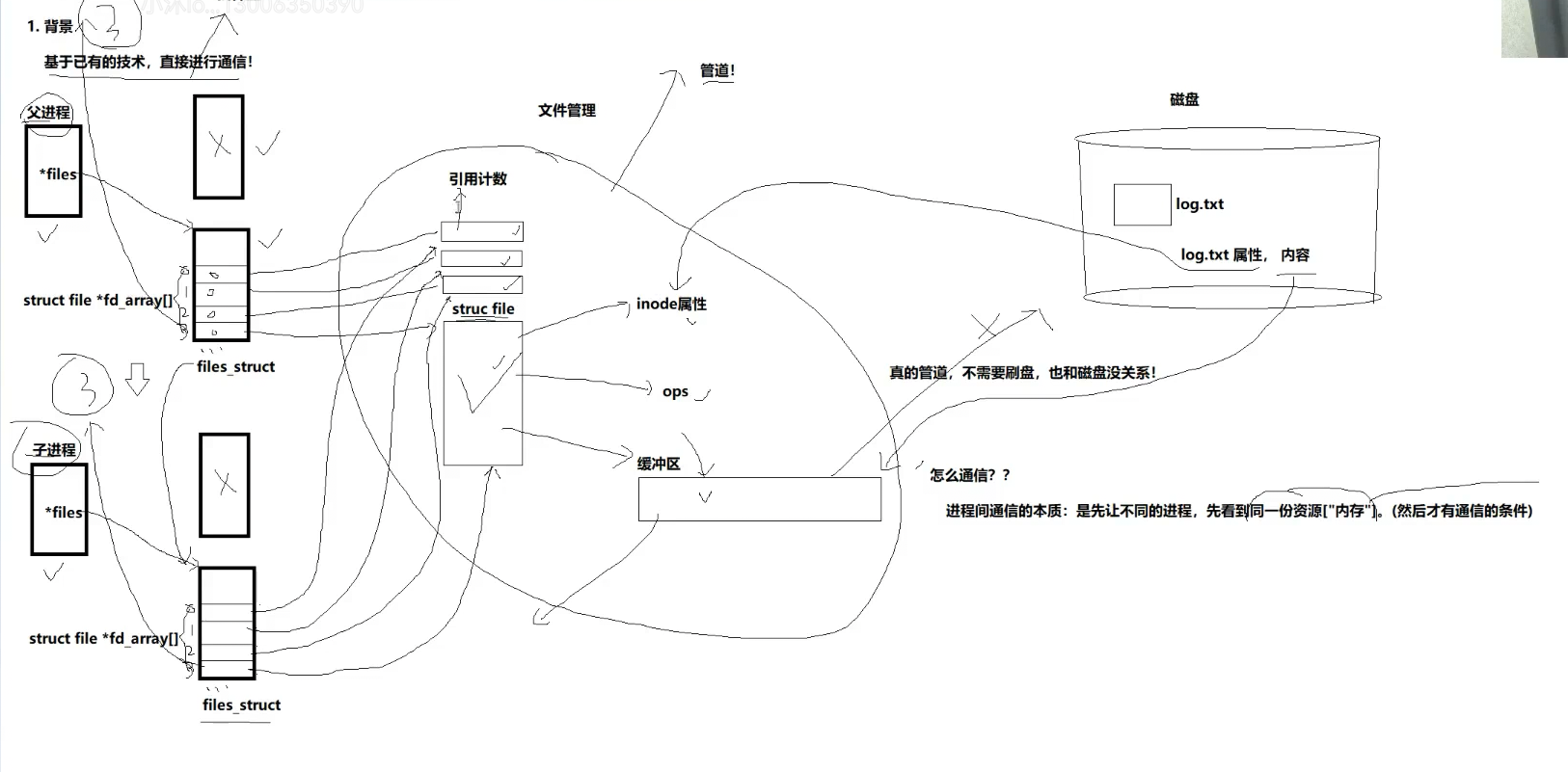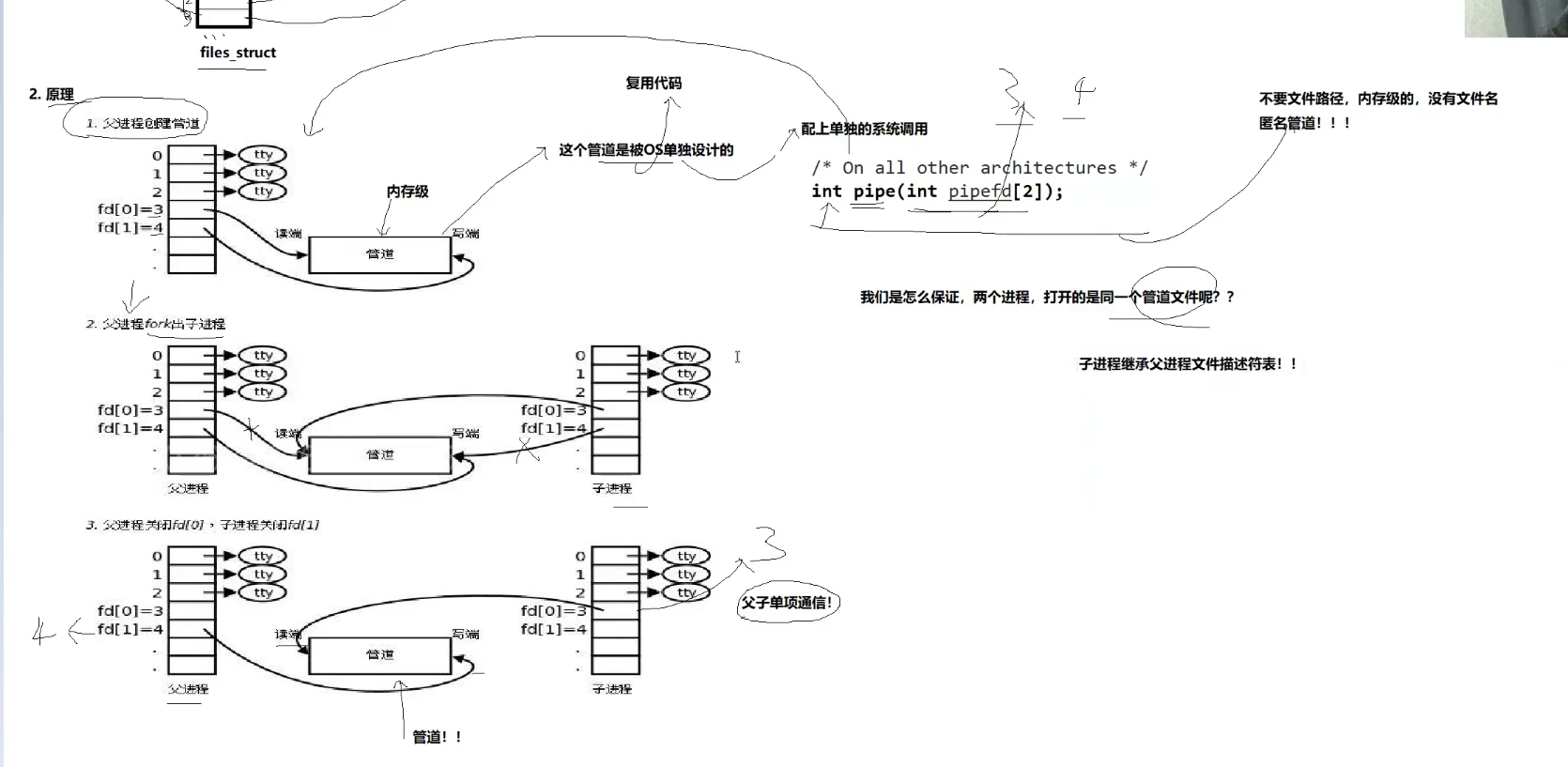看上图,父进程由*files指向files_struct,也就是文件描述符表,现在我们打开一个文件,fd = 3,对于打开的文件,该文件内容被存放在array[fd]中,我们创建一个子进程,子进程继承父进程的*files,files_struct等等,此时父子进程的指针指向同一块地方,也就是被打开的文件,于是父子进程同时可以访问该文件的缓冲区,或许你会疑问,被打开文件最后不是还要写回磁盘吗,其实真正的管道是由OS创建的一块内存,不需要刷回磁盘,和磁盘没关系,这也符合通信间的本质!!