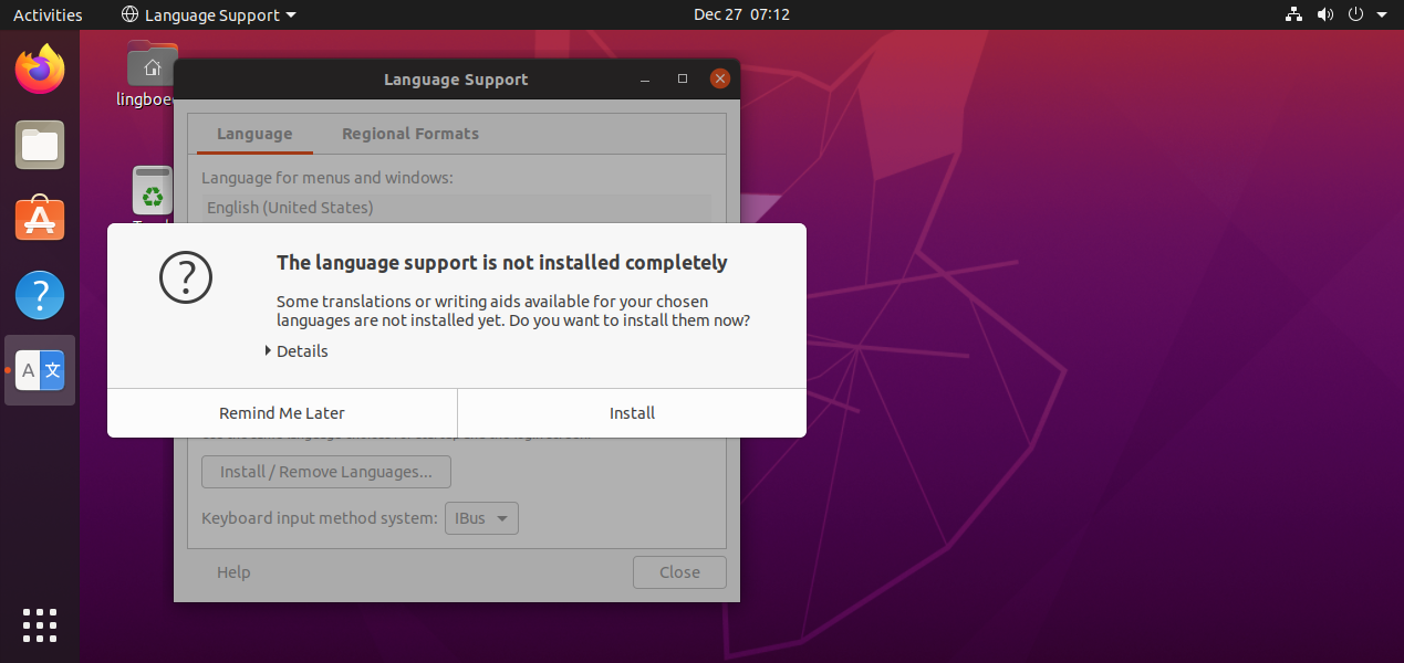 默认安装的 ubuntu 中只有英文语言,因此是不能显示汉字的。要正确显示汉字,需要安装中文语言包。安装中文支持步骤: