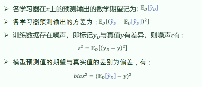 - 公式分解 : 泛化误差可以分解为三部分,: E=bias2+variance+noiseE = bias^2 + variance + noiseE=bias2+variance+noise