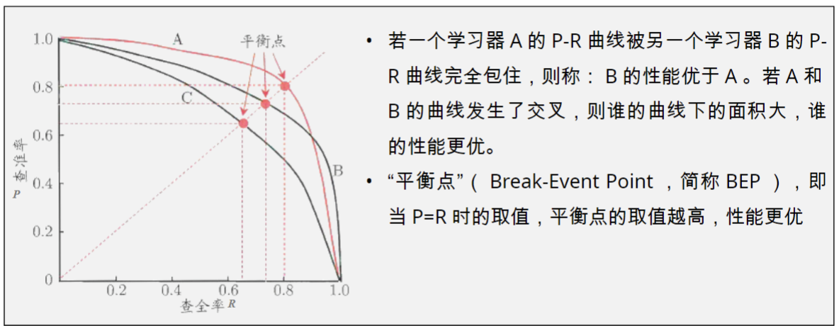 - P-R 曲线 :横轴 Recall,纵轴 Precision。平衡点 (BEP) 是 P=RP=RP=R 时的取值。曲线完全包住另一个则更优。