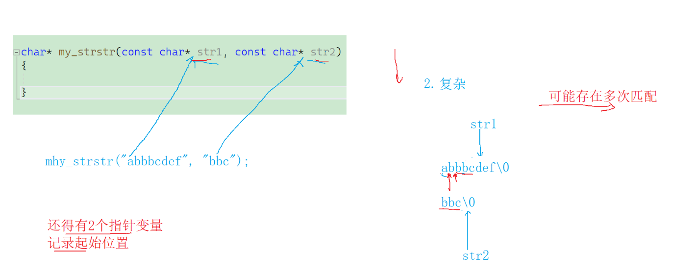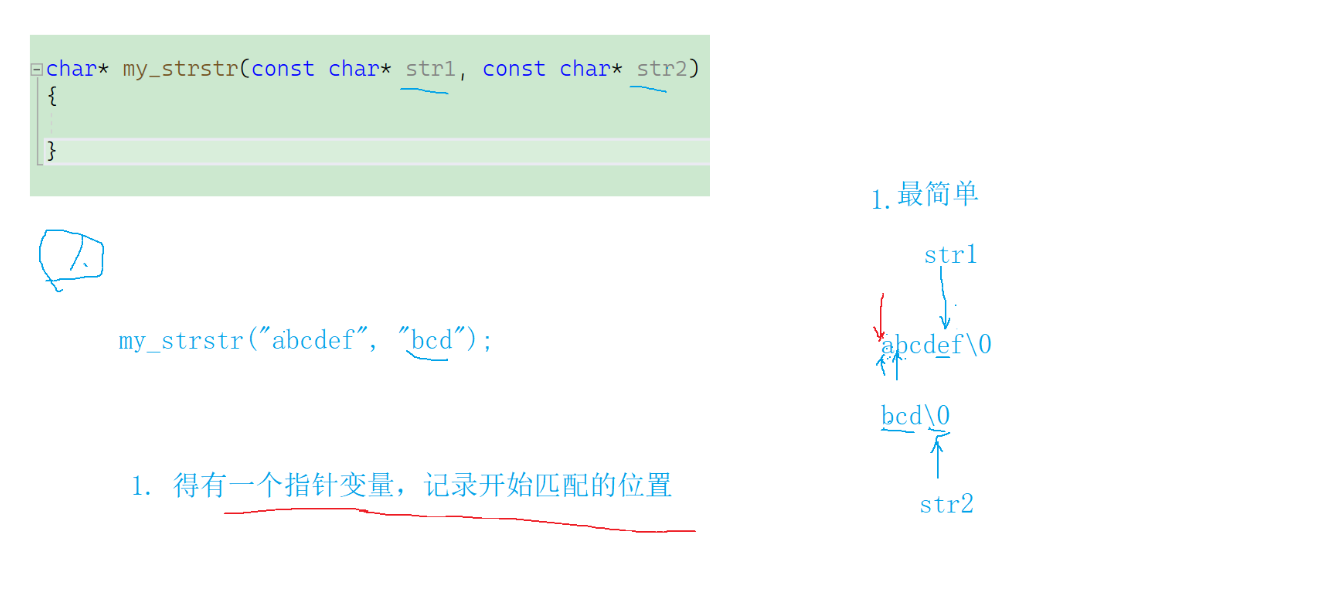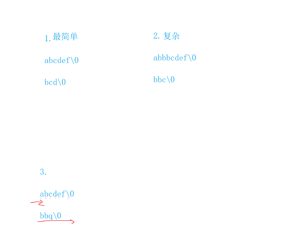 我们要模拟实现strstr函数,就得考虑以上三种搜索情况。