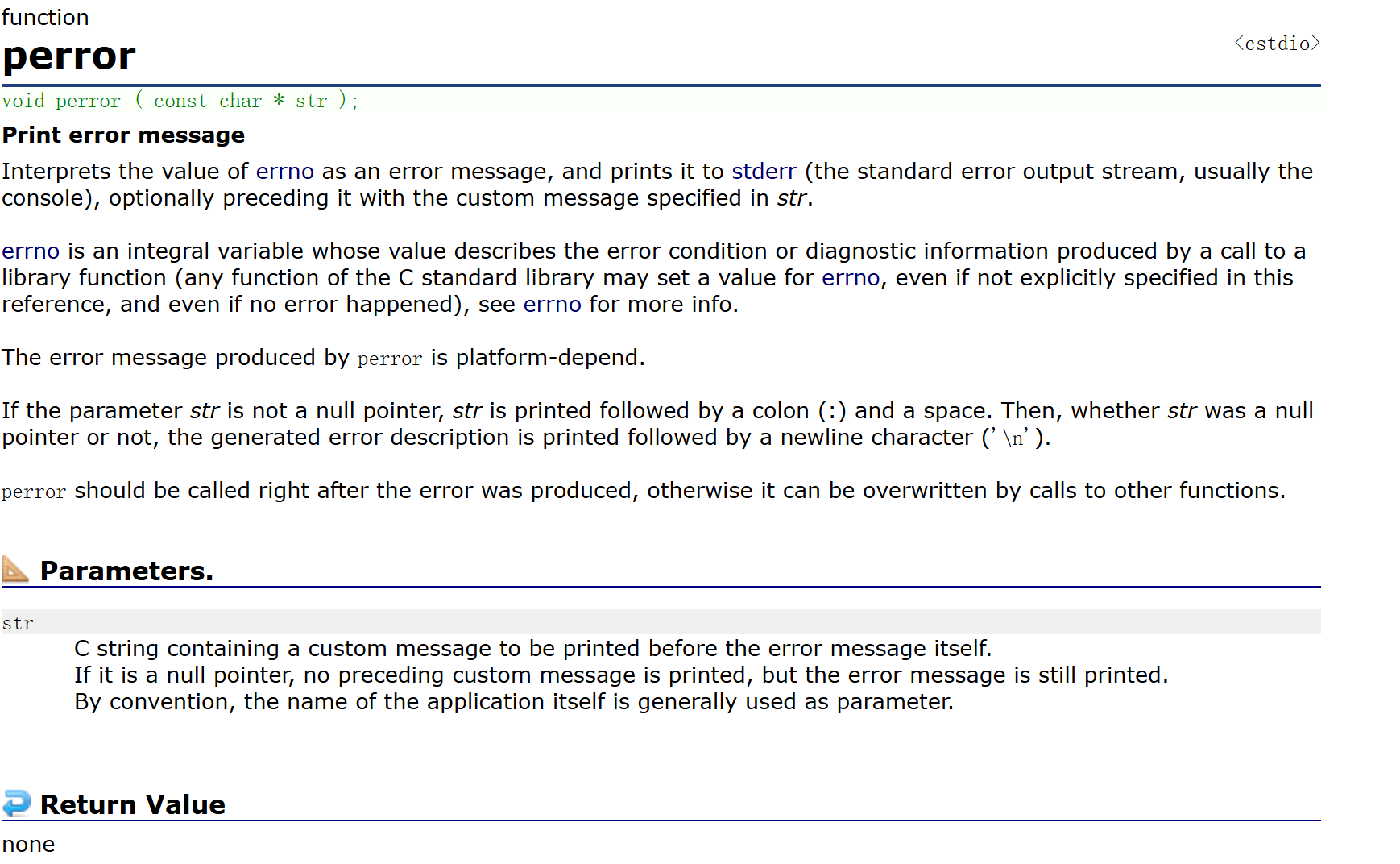 1.将errno的值解释为错误消息,并将其打印到stderr(标准错误输出流,通常为控制台),可选地在消息前添加str中指定的自定义消息;