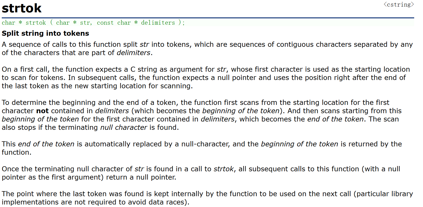 5.strtok的第一个参数为NULL,函数将在同一个字符串中被保存的位置开始,查找下一个标记;