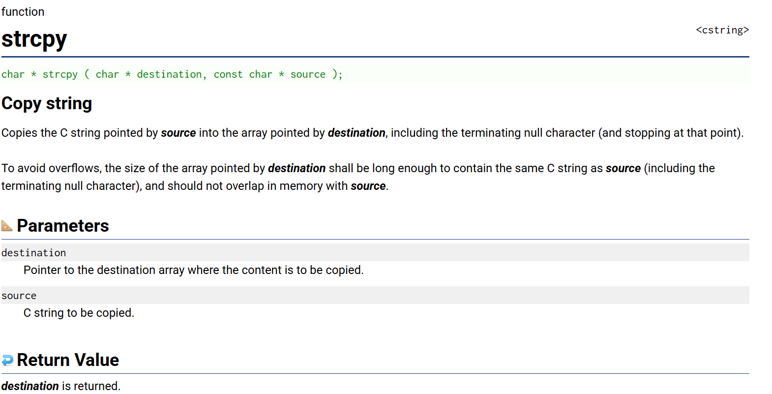1.Copies the C string pointed by source into the array pointed by destination, including the terminating null character (and stopping at that point);