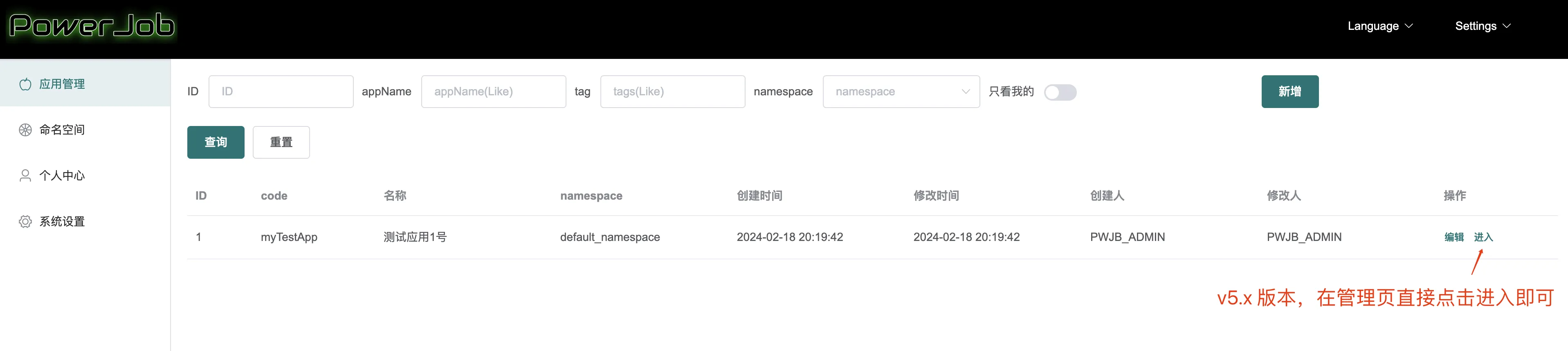 v5.x:在应用管理页面,选择对应的应用,点击右侧"进入"按钮即可。