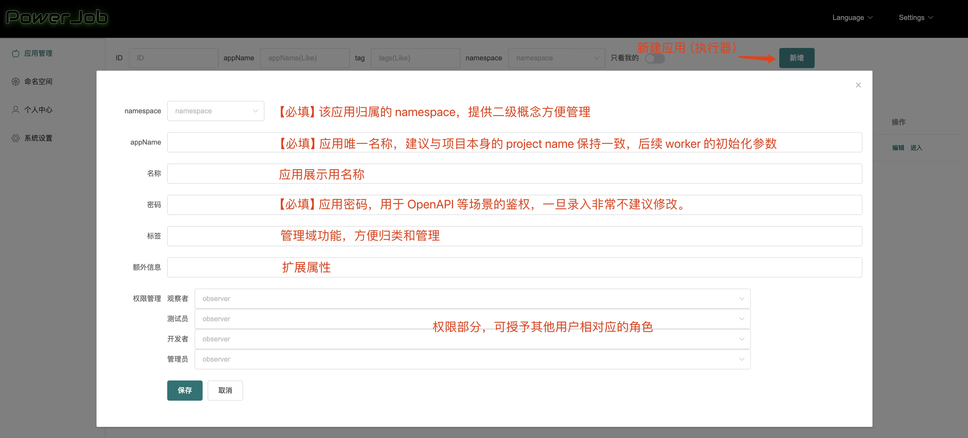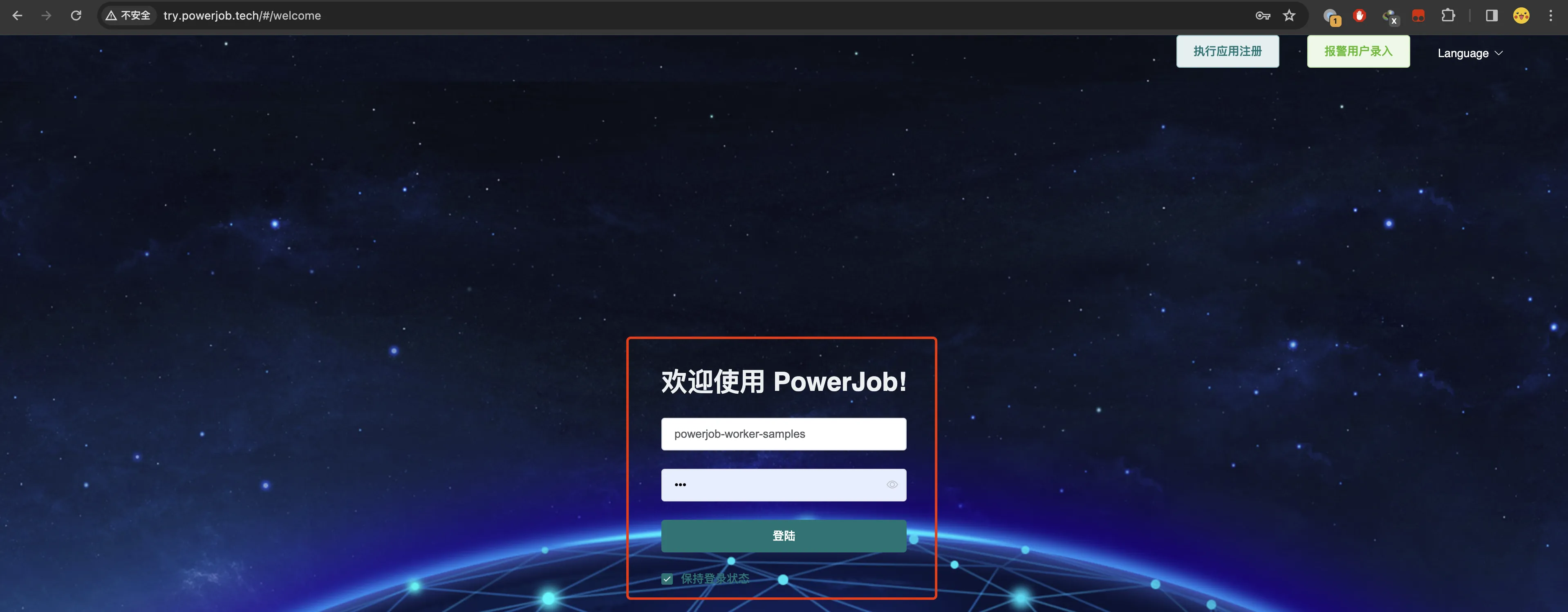 ○ v4.x及前序版本:点击主页应用注册按钮,填入 powerjob-worker-samples 和控制台密码(用于进入控制台),注册示例应用(当然你也可以注册其他的 appName,只是别忘记在示例程序中同步修改~)