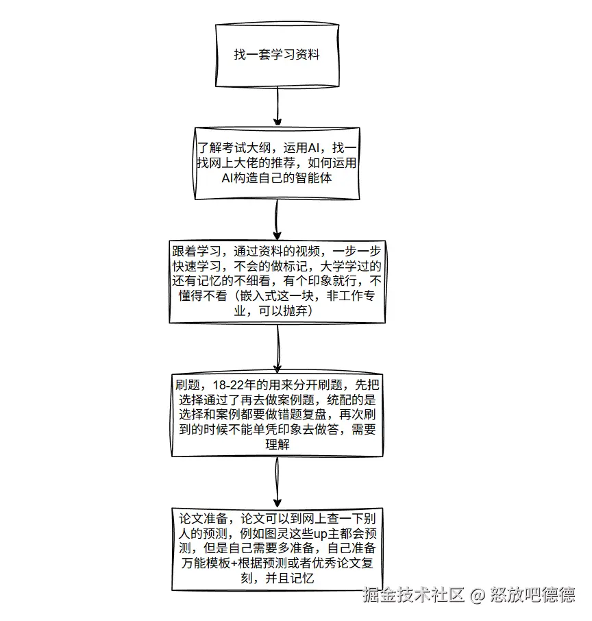 主要还是刷题,遇到哪里不会就去查资料,我习惯看看课件或者看教材,偶尔会查一下 ai,但是不要纠结,不会就是查。就比如,我当时对于范式的定义,函数依赖,什么是保持函数依赖、有损分解无损分解,怎么判断?首先需要考虑,这算个基础题,需要掌握的,所以我就去查教材、课件,问 AI,理解他,每次做争取做对。对于嵌入式,我是保持该记忆就记忆,不做深度追究。