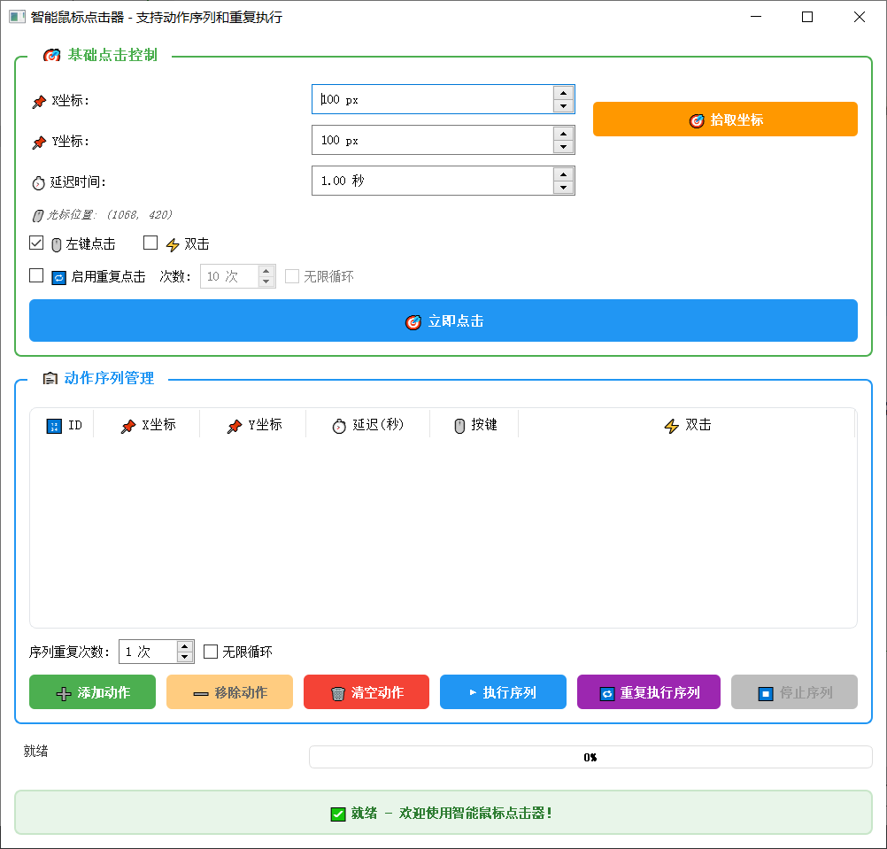 最近使用QT结合AI整了一款Windows端的鼠标点击器,可以帮我我们解放双手,按照既定的xy坐标去处理点击动作!