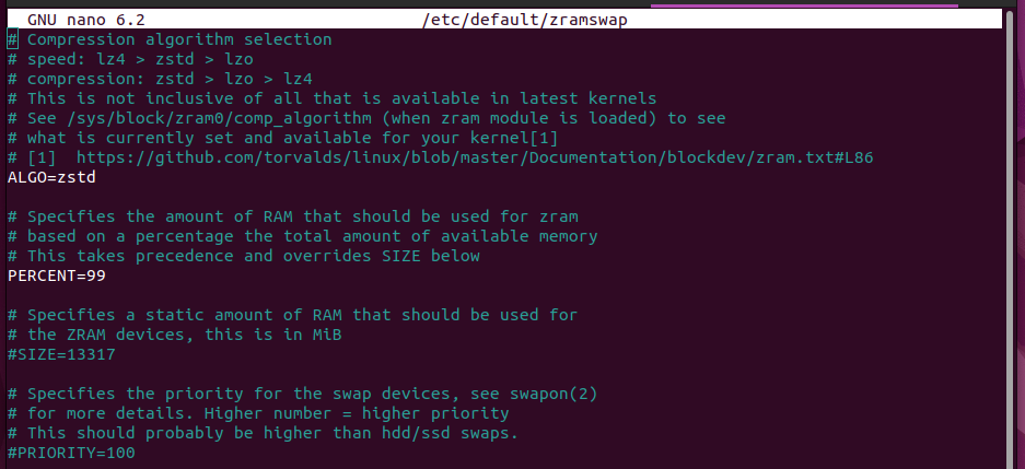`sudo nano /etc/default/zramswap`