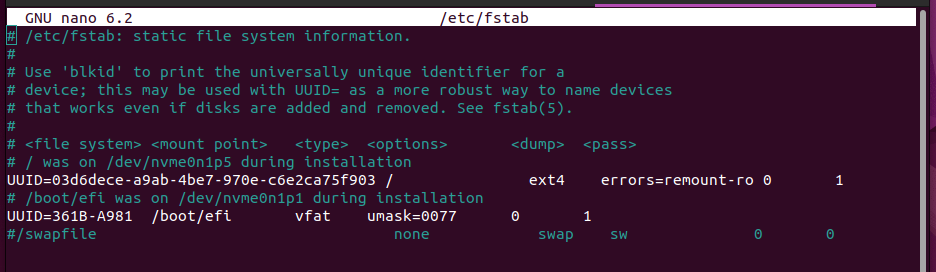 `sudo nano /etc/fstab