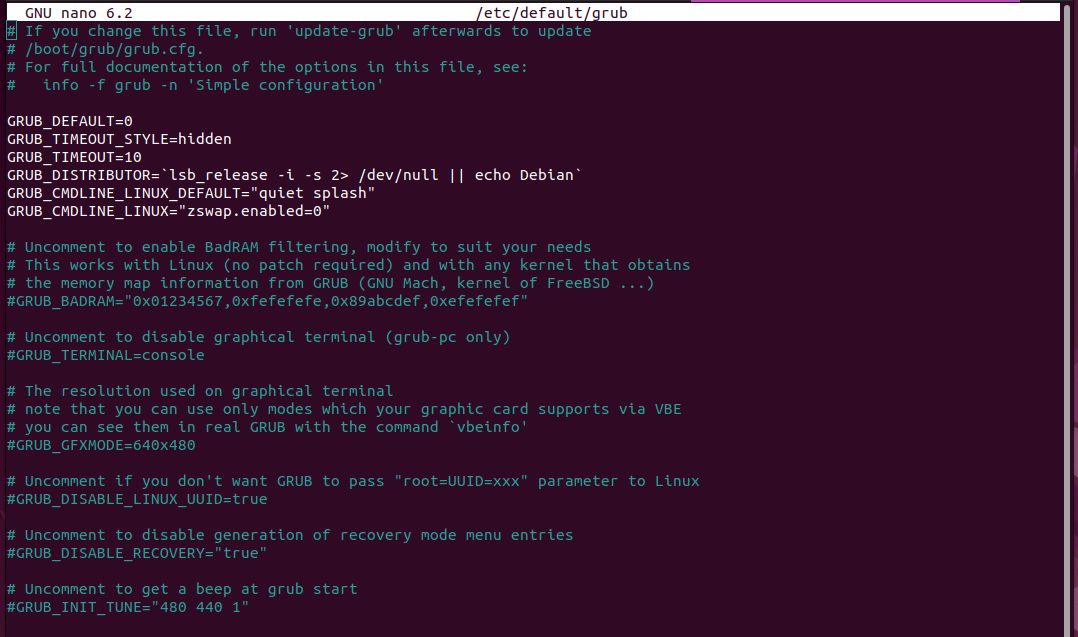 `sudo nano /etc/default/grub
