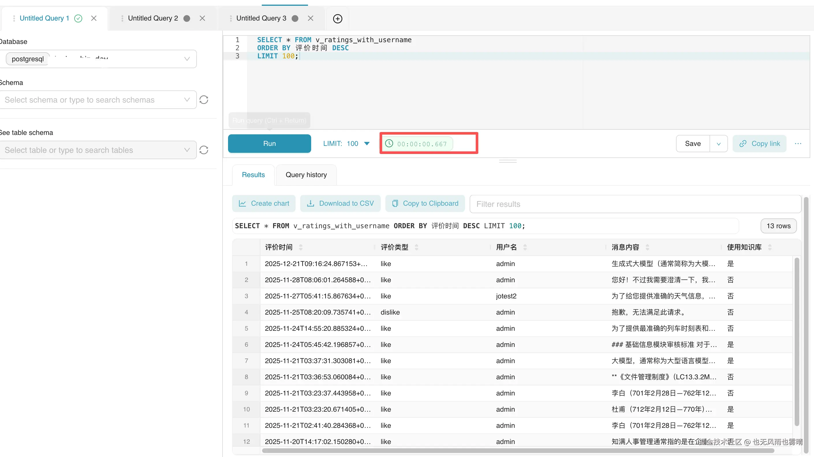 做运营看板的时候遇到个问题:需要把用户对 AI 回复的评价(点赞/点踩)和用户名一起展示出来。听起来简单,但数据分散在两个库里------评价数据在业务库,用户名在用户库。