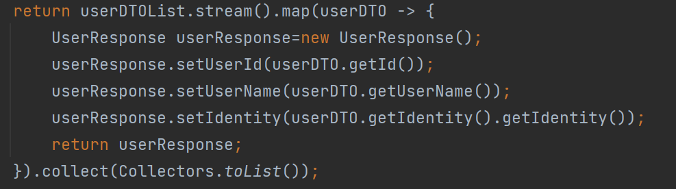 注意我们这里接口虽然定义没有传参,我们在设计的时候给他传一个identity(null全查,admin查admin,normal查normal),方便后续可重复使用,在写的过程中可以使用lambda来进行List元素的类型转化,还有我们也可以将service的dto的identity设置为枚举类方便我们对类型的控制(我们这里将DTO定义多个属性,方便重复使用),还有注意phoneNumber我们的DO外面包装了一层,我们赋值给dto的时候要取里面的值