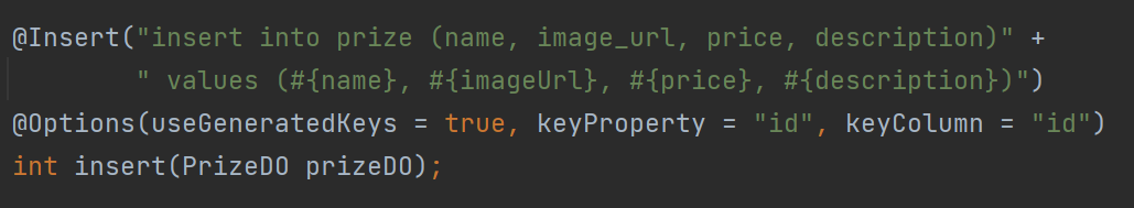 定义service接口以及实现类,这里我们只要做两件事情,1.保存图片到本地(调用我们之间写的图片保存功能的方法即可)2.将奖品的其他信息以及图片的索引写入数据库表中,由于我们这里涉及到了新的数据库图表,所以我们需要创建新的DO(对应数据库中的表类),我们开发一般使用一表一mapper,所以mapper层也要创建一个prize的mapper,建DO注意price类型是bigdecimal以及他继承一下base类(里面有id,创建时间,更新时间),我们这里service层调用mapper层时候我们这里直接使用DO传给mapper层来插入,注意我们这里需要给前端返回id,但是我们sql返回的是影响的行数,所以我们这里可以让mapper他插入之后将id写回给DO的id只需要加上option注解