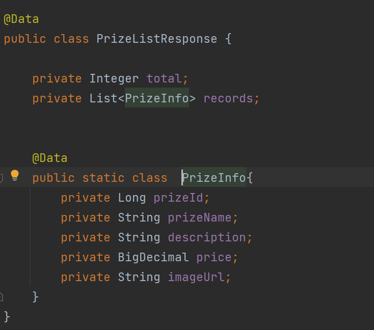 只要是与分页有关的查询列表的话我们都可以重复使用这个对象不止是查询奖品列表,其实前面的人员也可以用这个,后面的活动列表也可以用这个,mapper层查完后的列表转换成dto,dto到达controller层再通过lambda表达式转换成controller层需要返回给前端的对象即可,这样子设计是为了重复使用