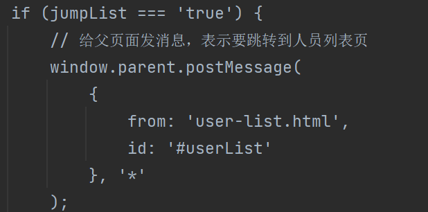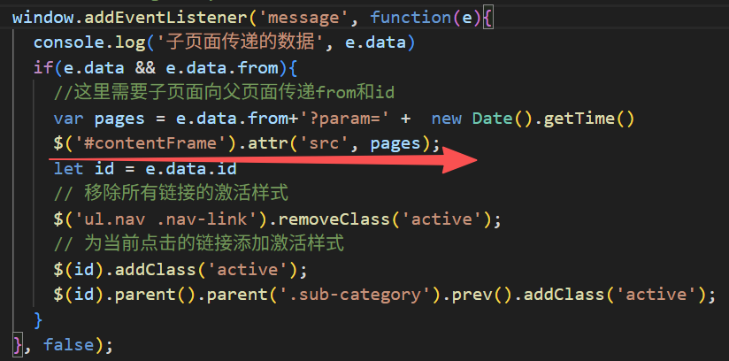 使用window.parent.postMessage({},''),一个参数是传的信息,第二个参数是发给哪个url,注意这里走的是本地内存,不是发http请求,然后父页面通过接收from和id去跳转到该from所指引的html和修改相应id的样式