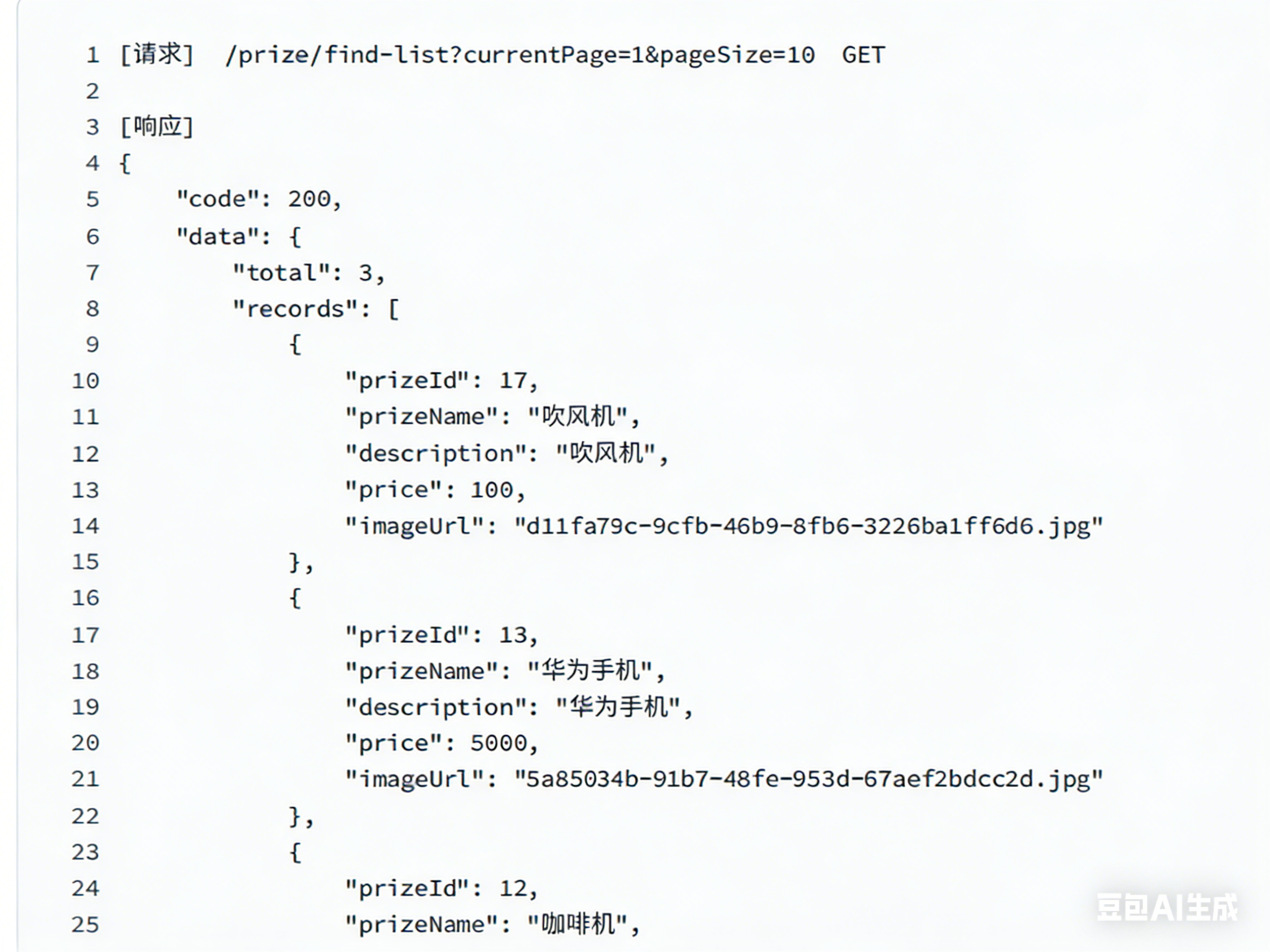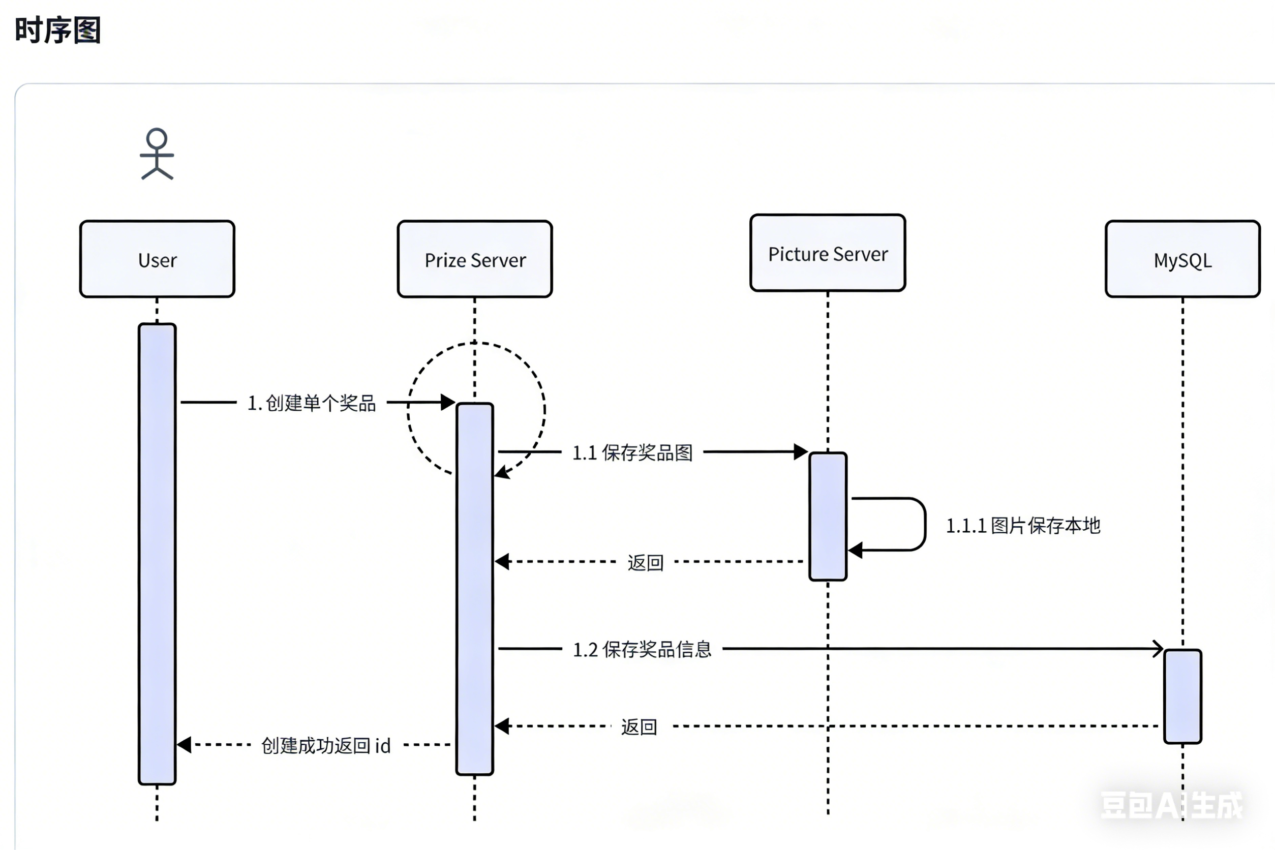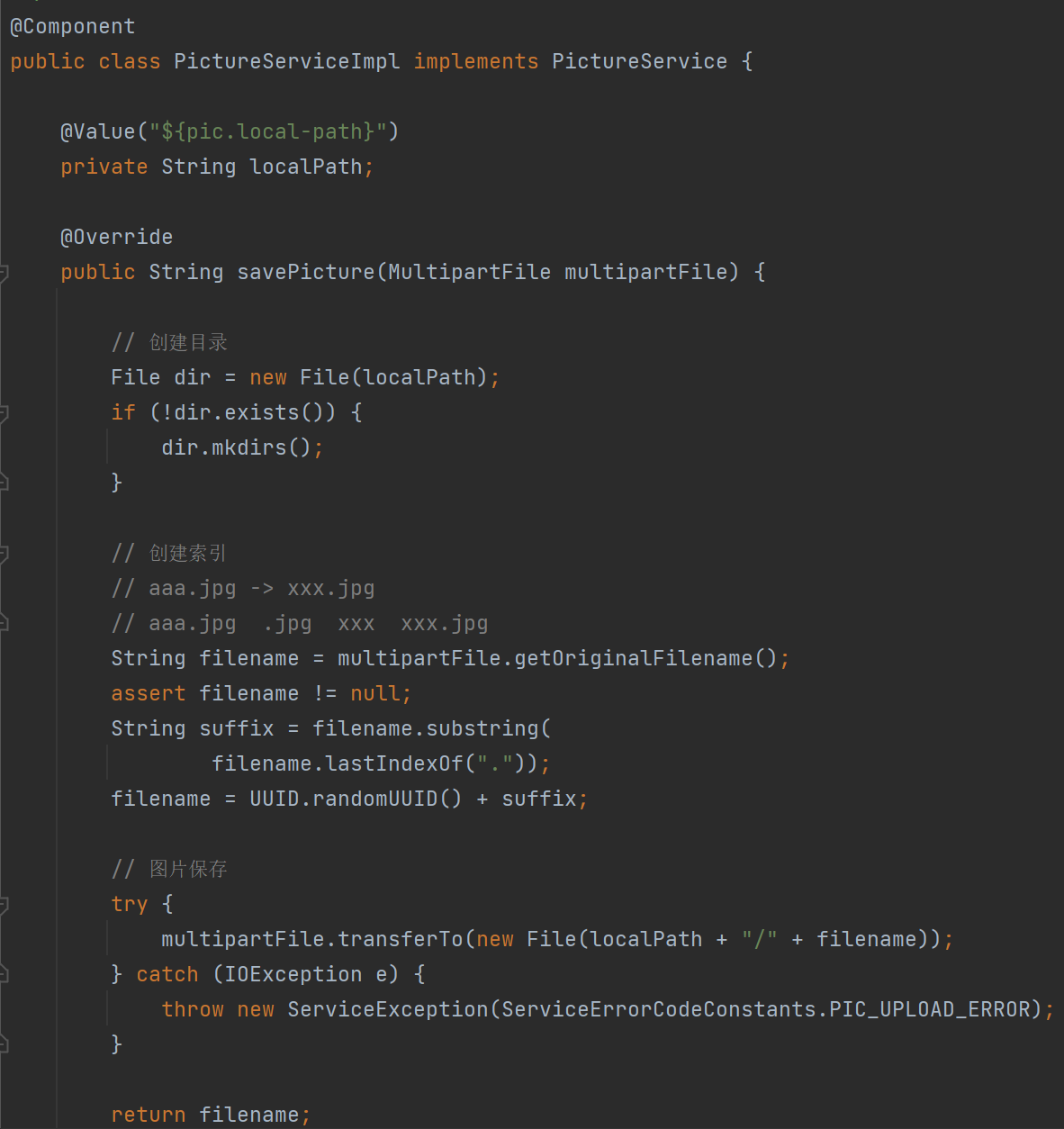 这个功能主要是用于奖品创建的时候添加图片的时候使用,创建一个picture的service接口以及其实现类,里面只有一个方法用于接收前端传来的图片文件,并且将他保存到服务端本地存储目录中,这里我们有几个事情需要知道,我们这里使用MultipartFile来接收前端传来的对象,然后1.创建目录(mkdirs方法,没有目录创建,有目录直接用本地目录建议写在配置文件中,然后从配置文件中去读取) 2.创建索引(这里索引是方便后续查找的时候用于定位图片文件,使用uuid+文件后缀的方式来实现,这里其实就是重命名确保唯一性)3.图片保存到本地存储中(使用transferTo,这个方法会抛异常,捕获后就是文件保存失败,就是上传失败了,所以抛一个自定义service层异常),4.返回索引