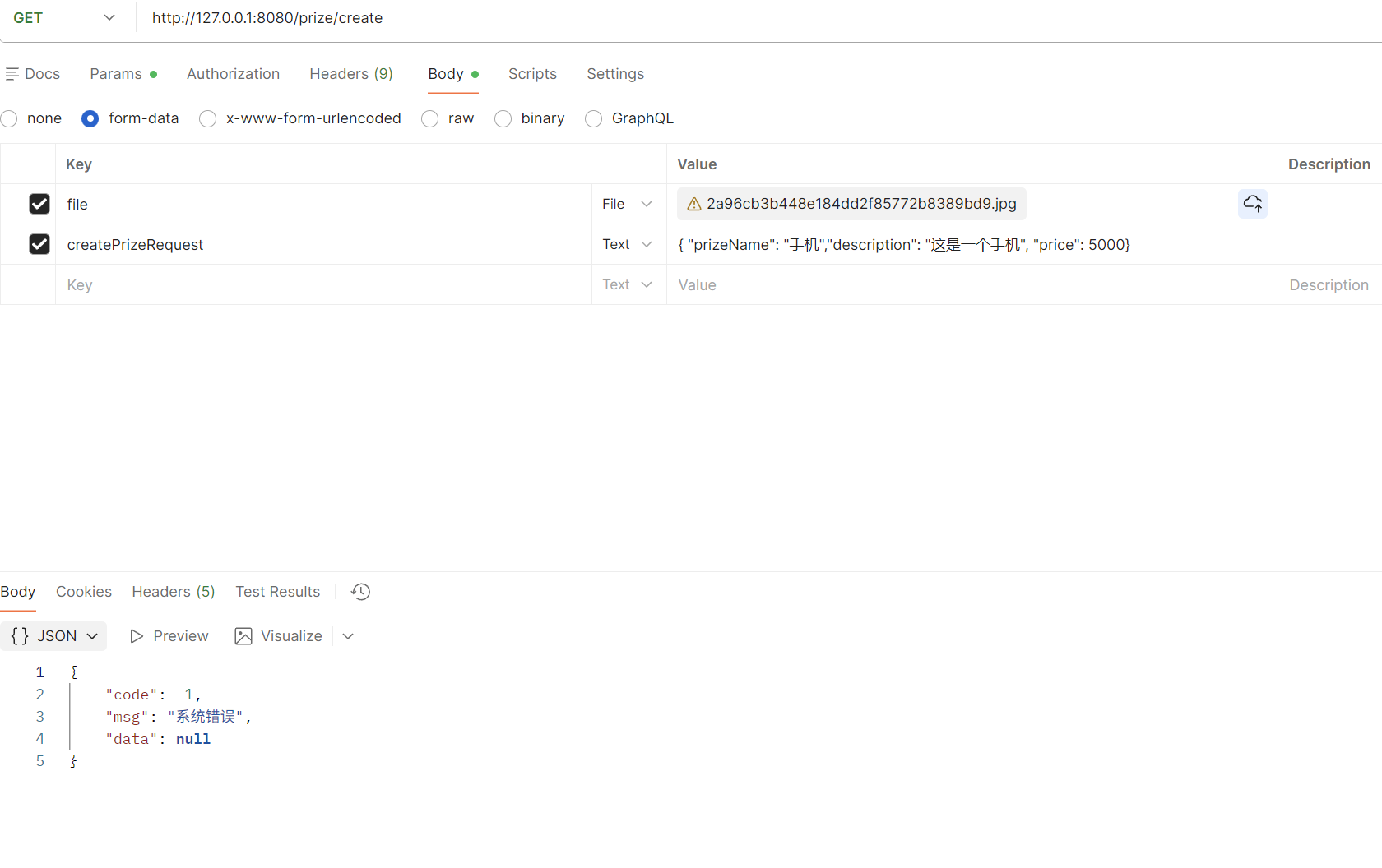 这里已经不涉及usercontroller,我们这里对应前端创建一个PrizeController,以及对应的prizeSerice接口以及其实现类,这里需要注意一点就是,前端传来两个参数且是表单传来的,对于表单发来的数据,正常数据变量名对应,对象名对应(其属性也对应)可以不用加注解@RequestPart,但是对于传来的文件是必须要加的