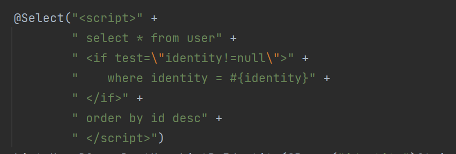 注意:我们这里identity的有可能传空所以service层要对传来的identity,进行判断是要进行什么样子的搜索select语句的话,使用这种写法加上if语句